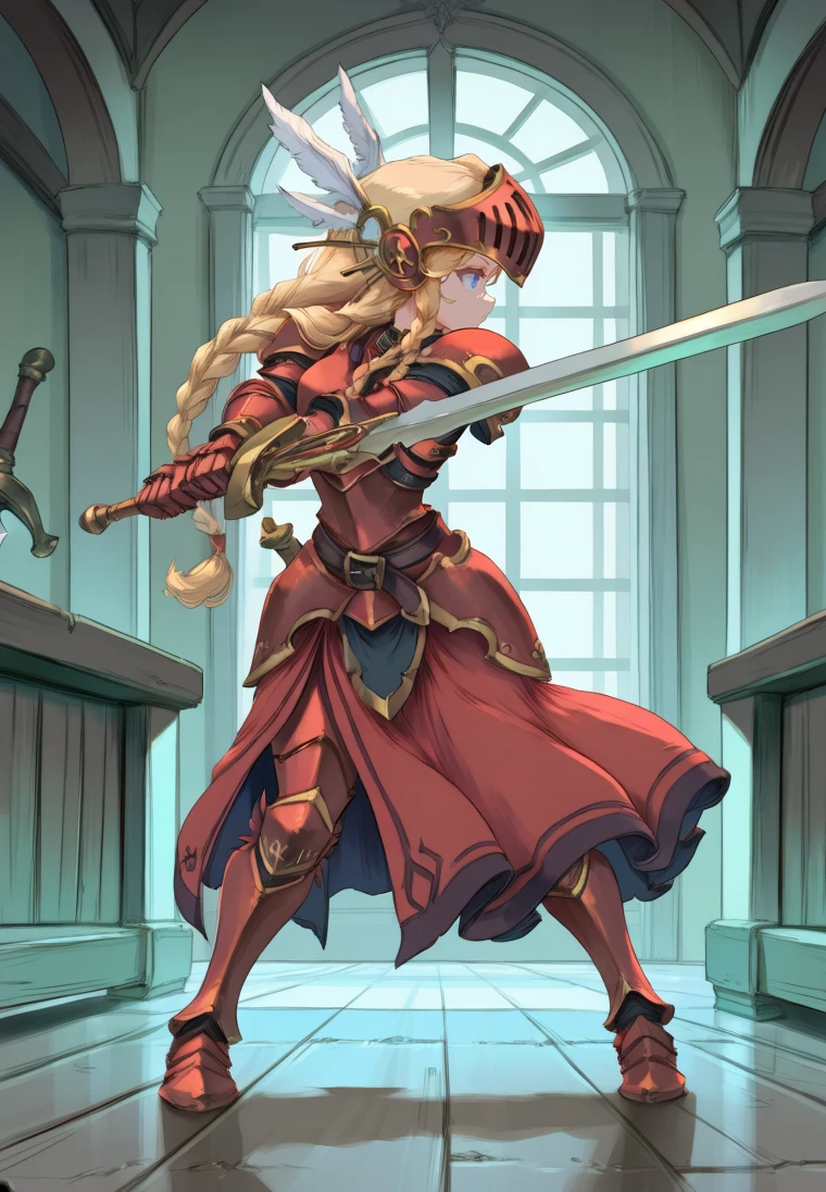 Aegina Eine Artwaltz: 1girl, blonde hair, long hair, braid, single braid, low-tied long hair, blue eyes, valkyrie, visor (armor), winged helmet, armored dress, armor, gauntlets, boots,