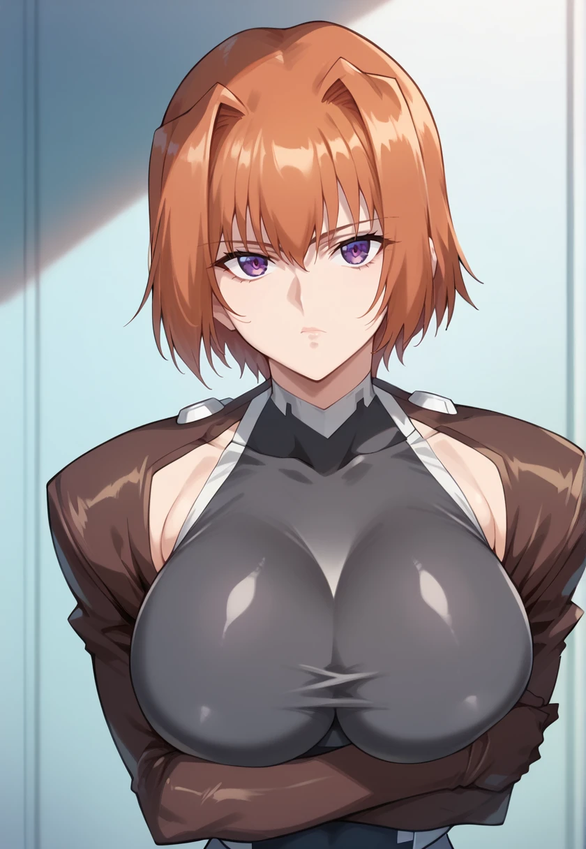 short hair, orange hair, purple eyes, large breastsAttire