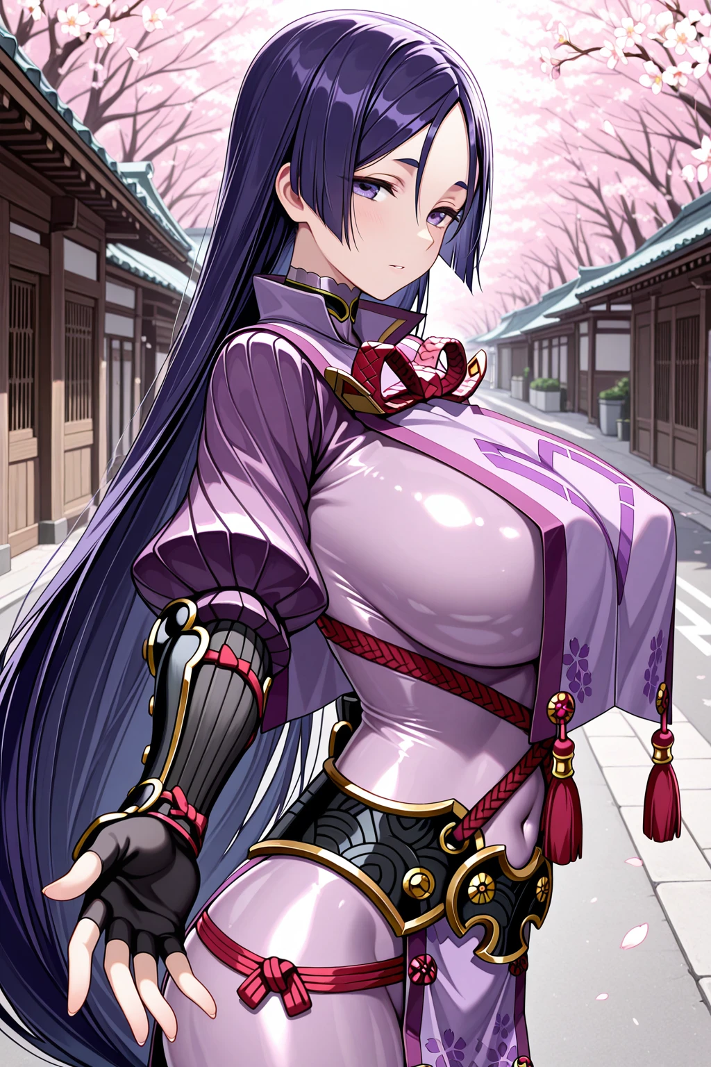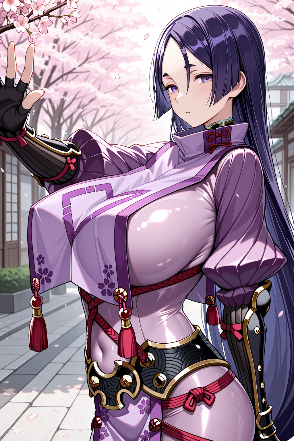 armor, black gloves, tabard, covered navel, elbow gloves, fingerless gloves, japanese armor, kote, pelvic curtain, purple ????????, ribbed sleeves, rope, tassel๐๐๐ถ๐บ๐๐๐ถ๐ ๐น๐ฎ๐ป๐ฐ๐ฒ๐ฟ ๐ฎ๐ป๐ฑ ๐ฎ๐๐ฐ๐ฒ๐ป๐๐ถ๐ผ๐ป: