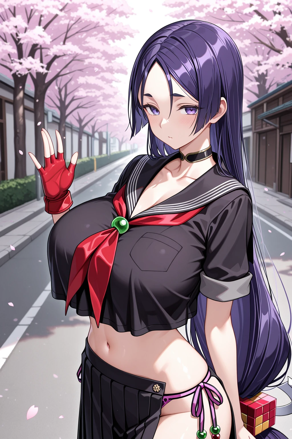 minamoto no raikou (swimsuit lancer) (second ascension) (fate), choker, black serafuku, black shirt, black skirt, collarbone, crop top, single fingerless gloves, long skirt, side slit, navel, pleated skirt, red gloves, red neckerchief, rope, short sleeves, side-tie ?????? bottom, swimsuit๐๐๐ถ๐บ๐๐๐ถ๐ ๐น๐ฎ๐ป๐ฐ๐ฒ๐ฟ ๐ฏ๐ฟ๐ฑ ๐ฎ๐๐ฐ๐ฒ๐ป๐๐ถ๐ผ๐ป: