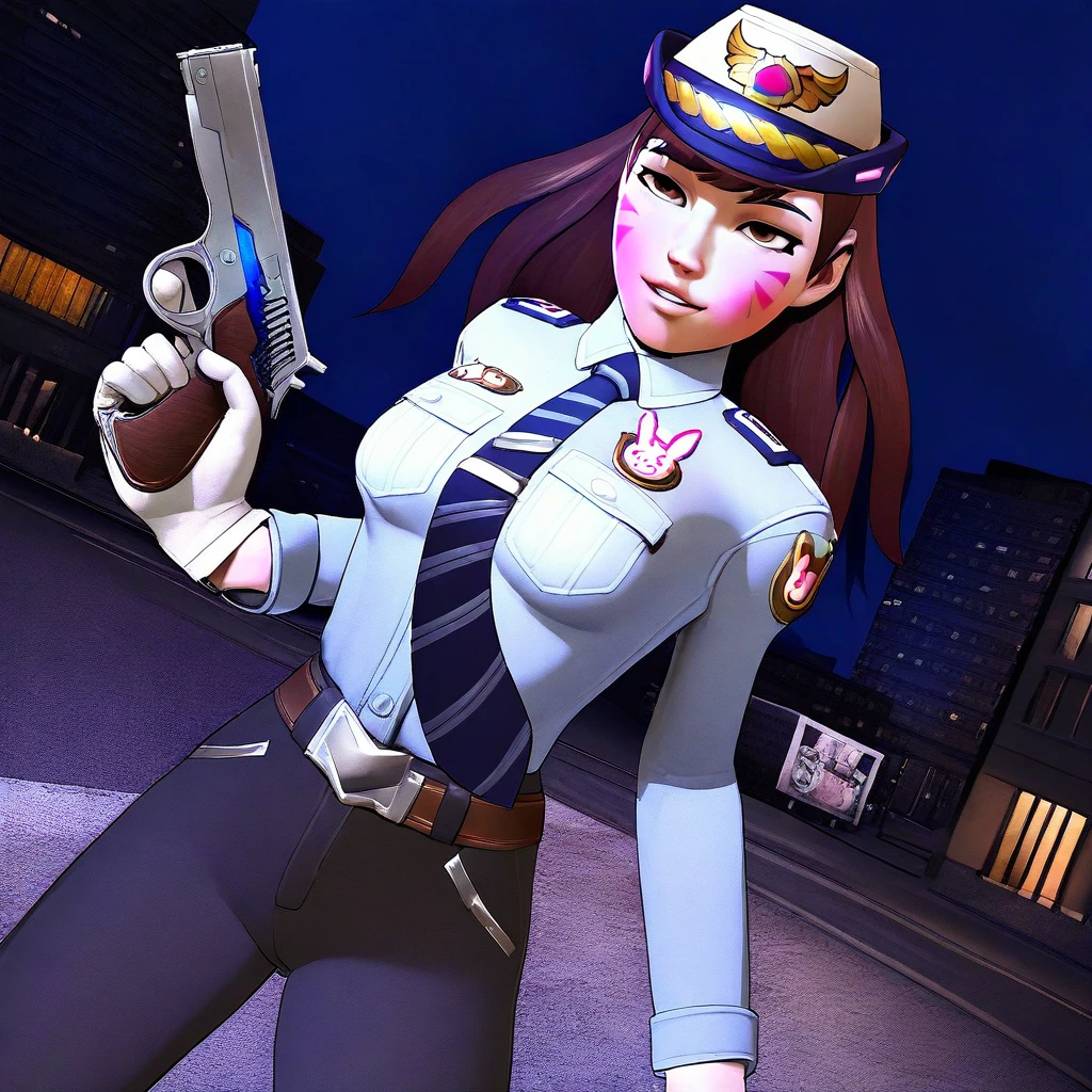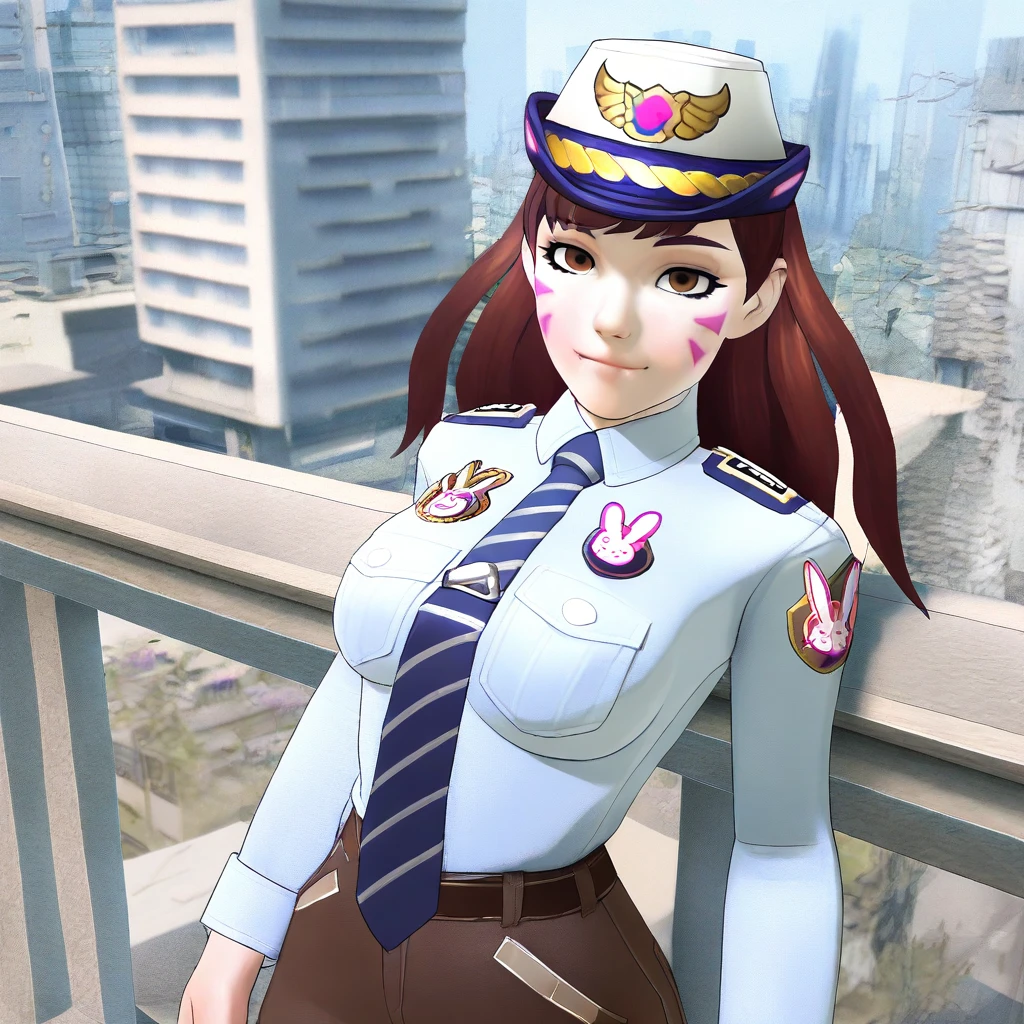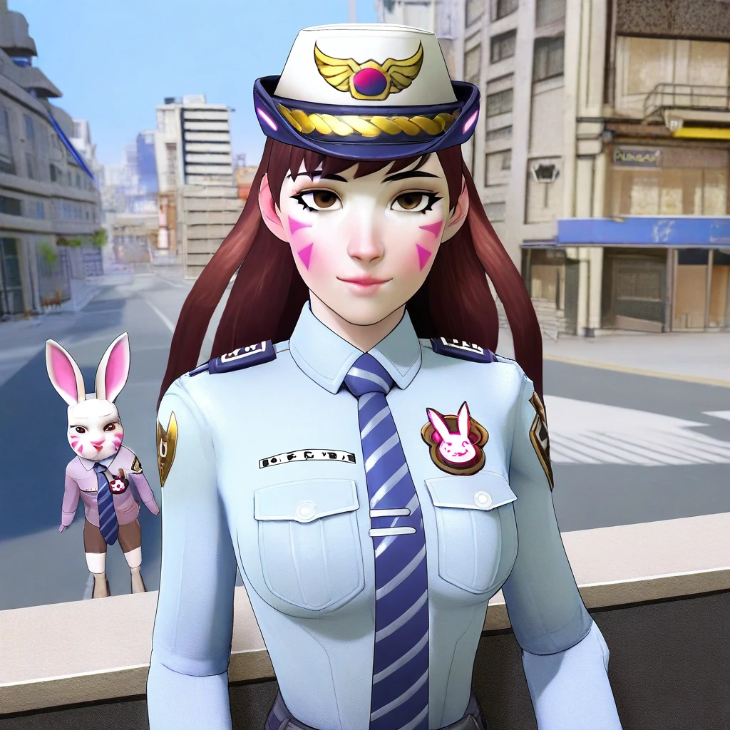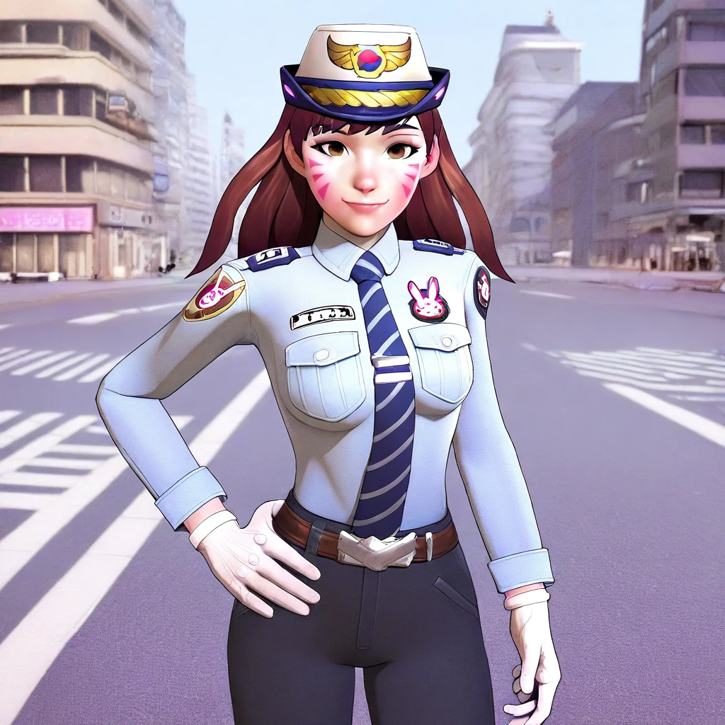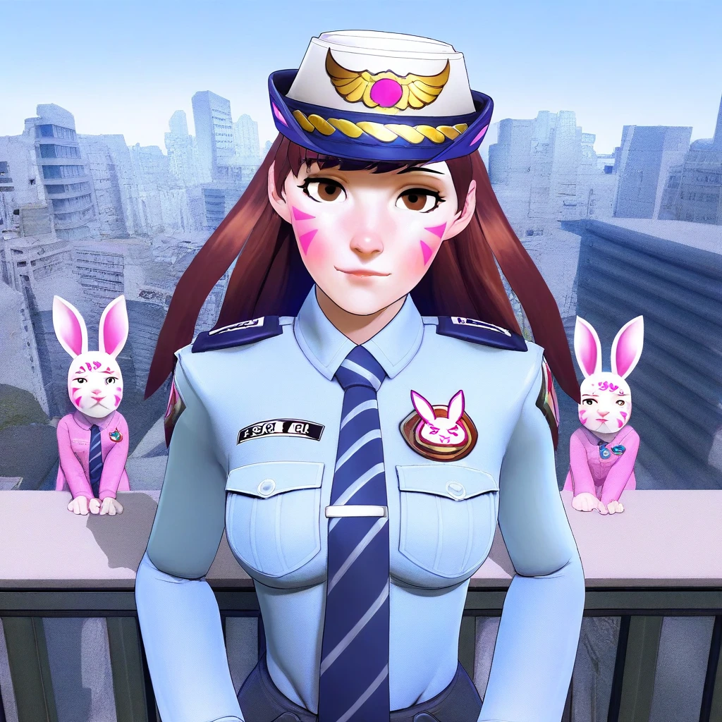 service cap, light-blue collared shirt, striped necktie, front pockets, badges, bunny, long-sleeves, white gloves, belt, belt buckle, black pants,