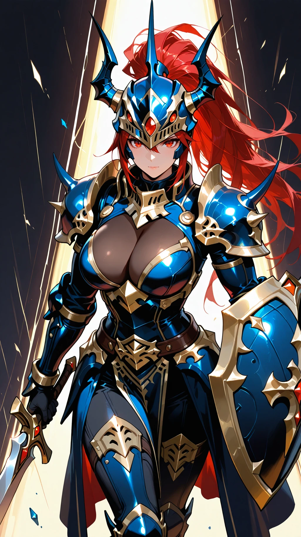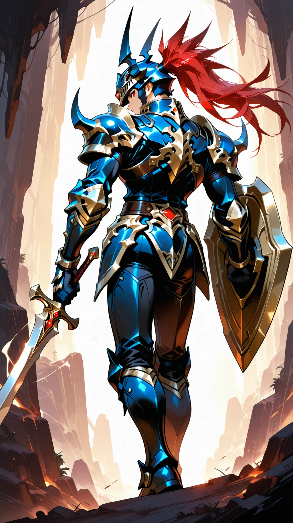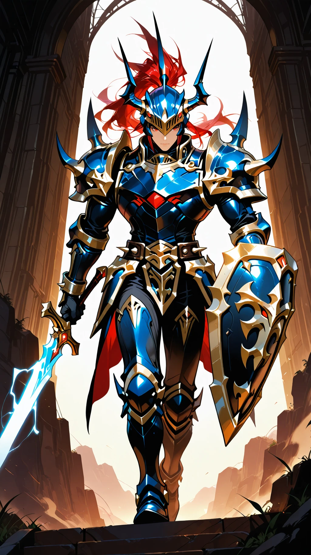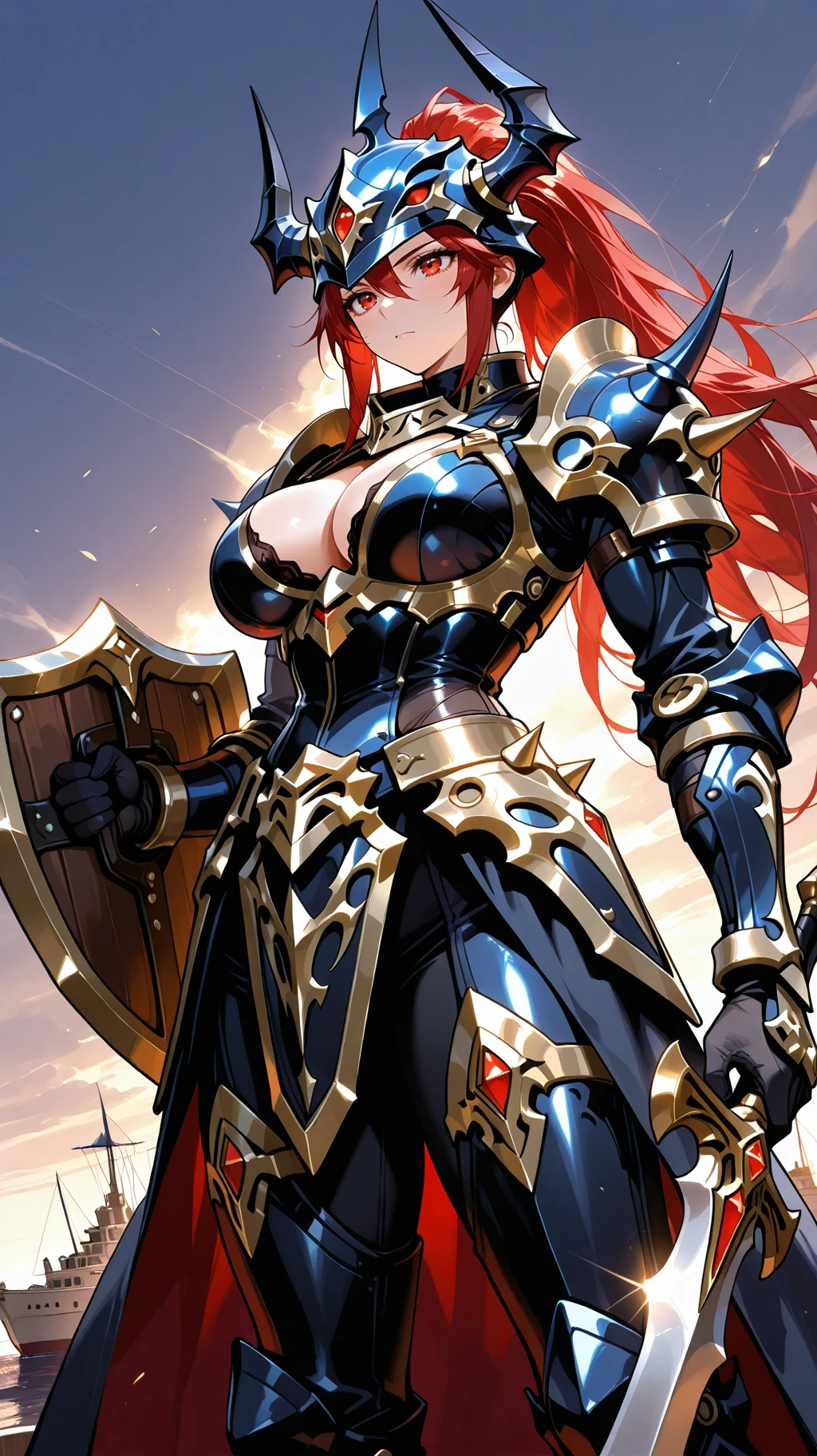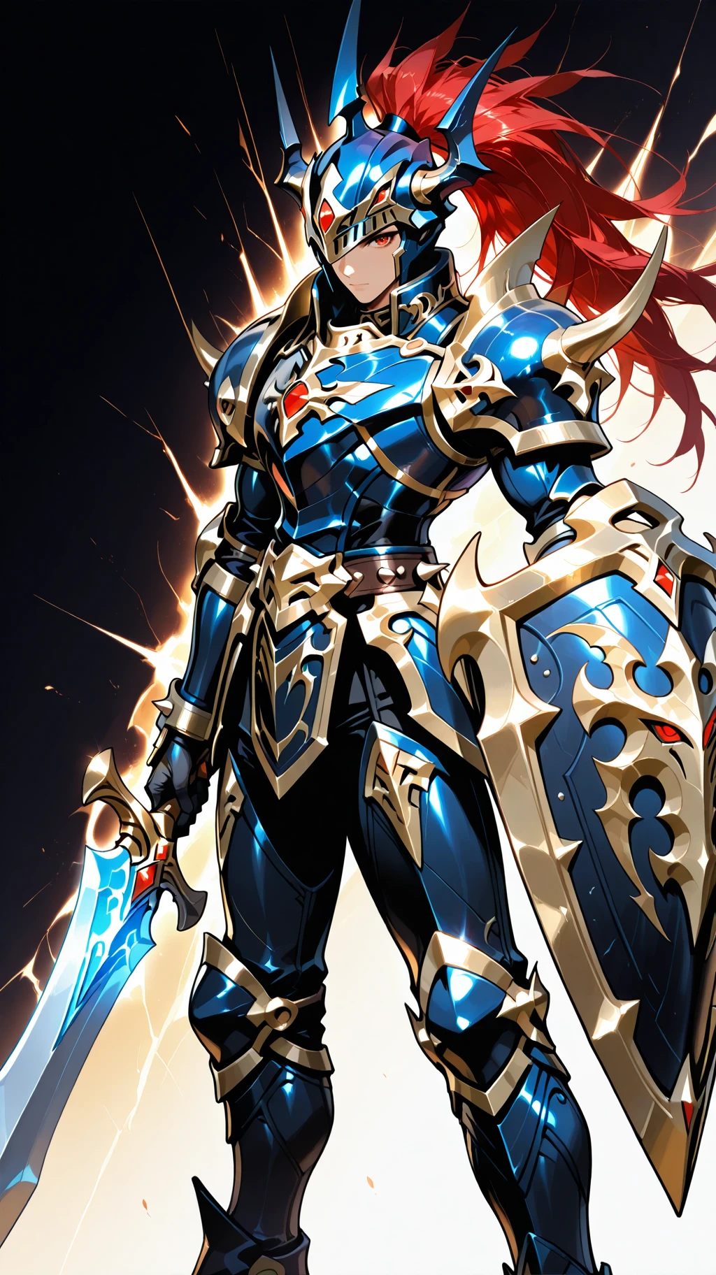 Prompt Suggestions: long hair, red hair, red eyes, helmet, horned helmet, armor, shoulder armor, holding sword, hold shield, spikes, spikes armored boots, sword, long sword, long single braid, Black Luster Soldier
