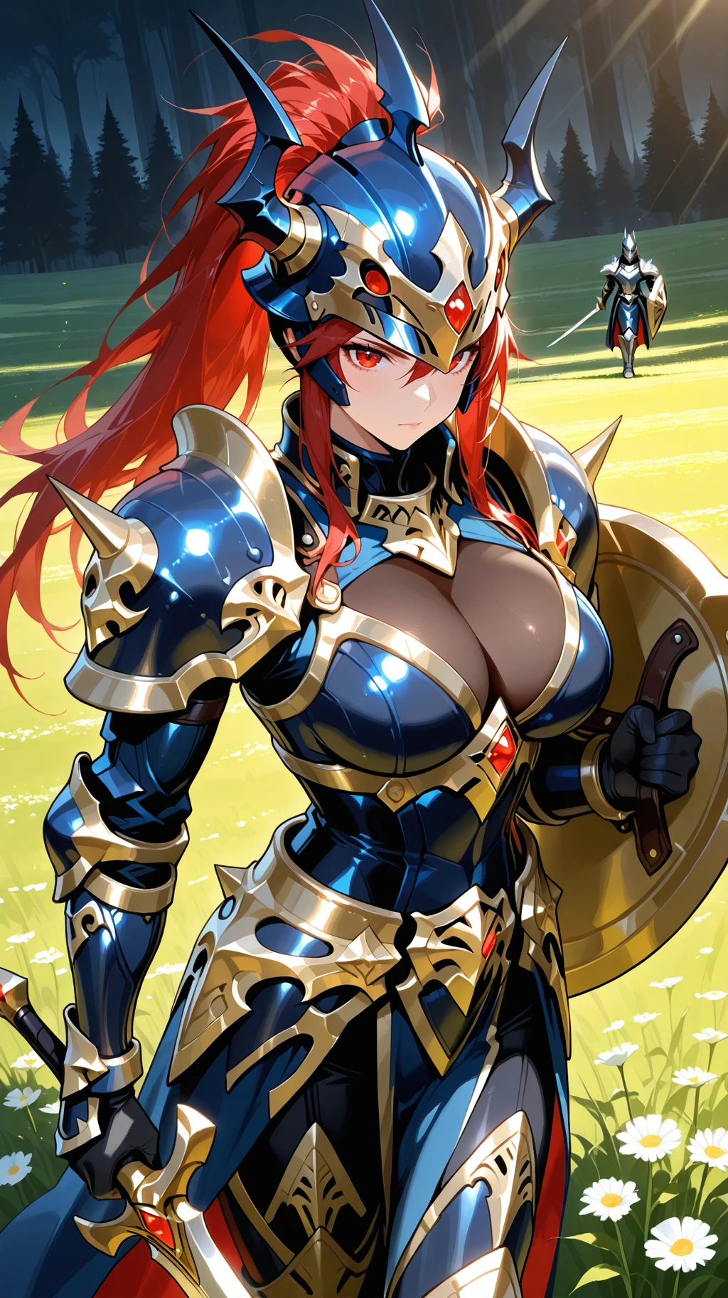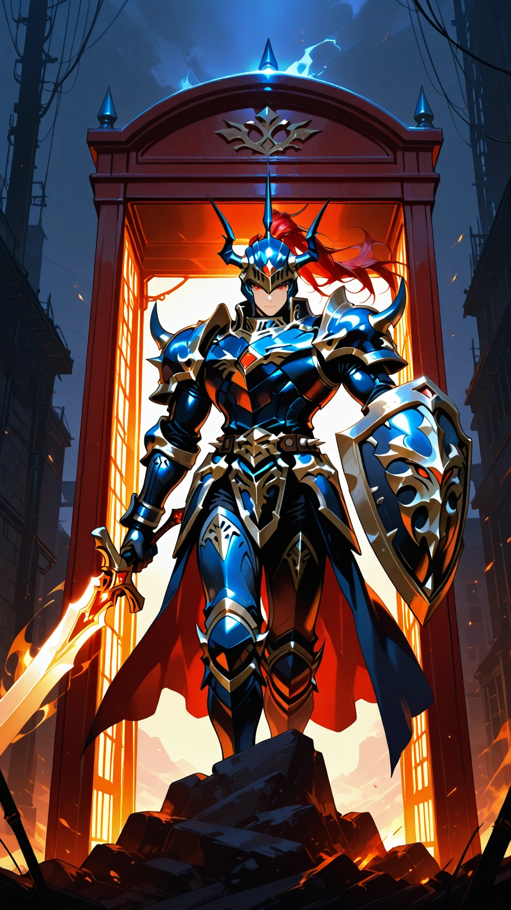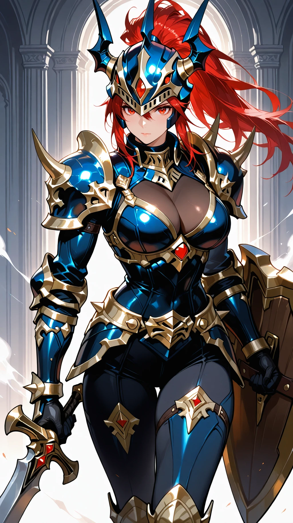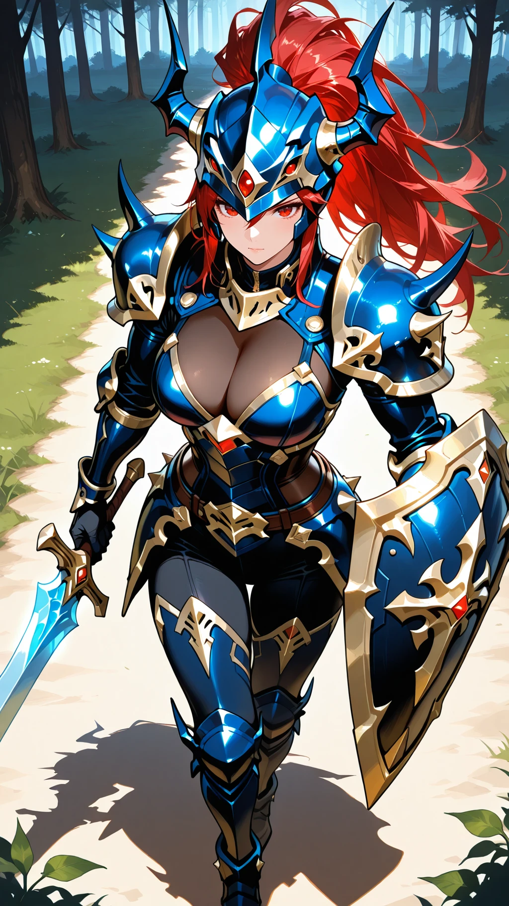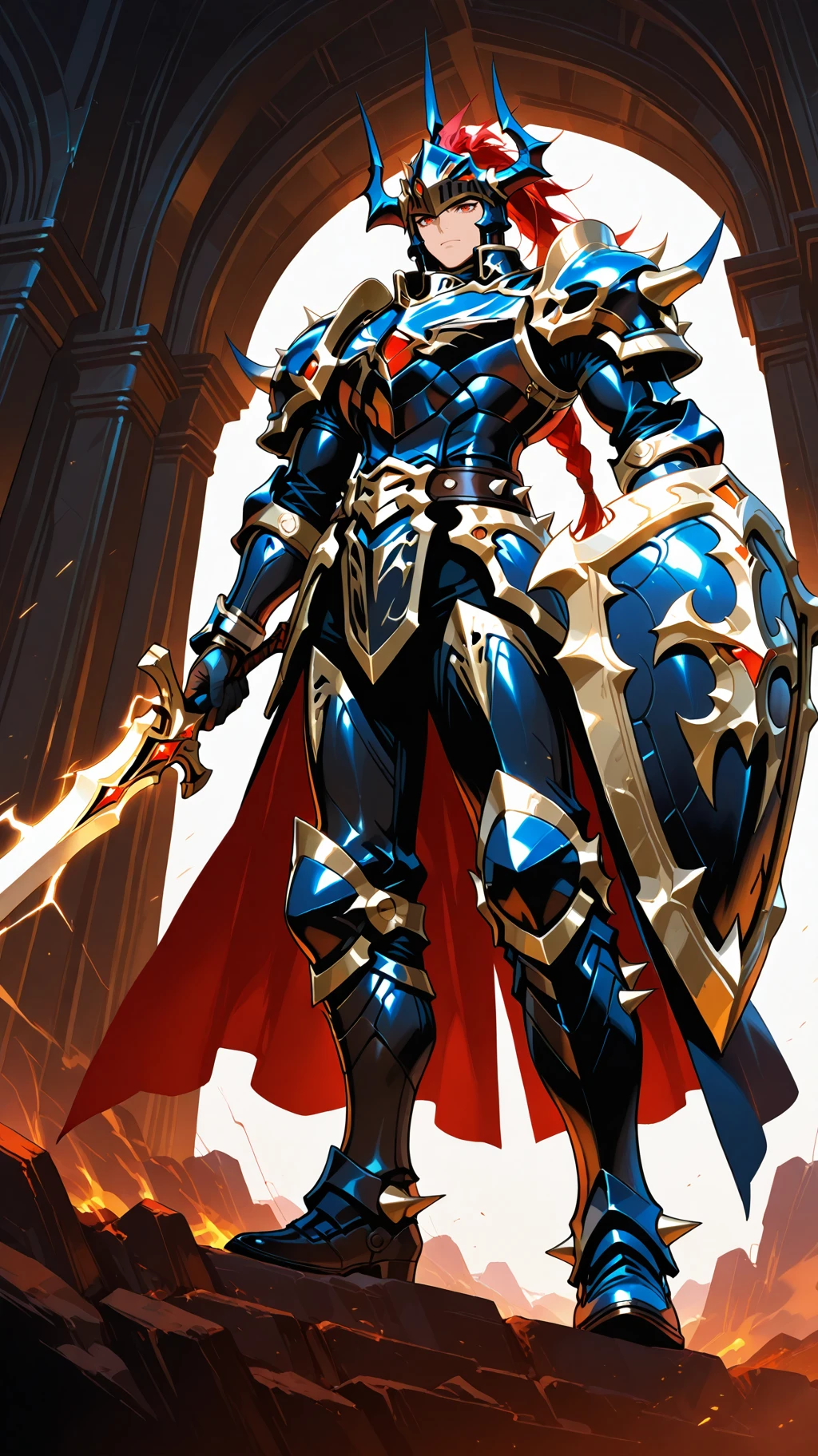 Prompt Suggestions: long hair, red hair, red eyes, helmet, horned helmet, armor, shoulder armor, holding sword, hold shield, spikes, spikes armored boots, sword, long sword, long single braid, Black Luster Soldier