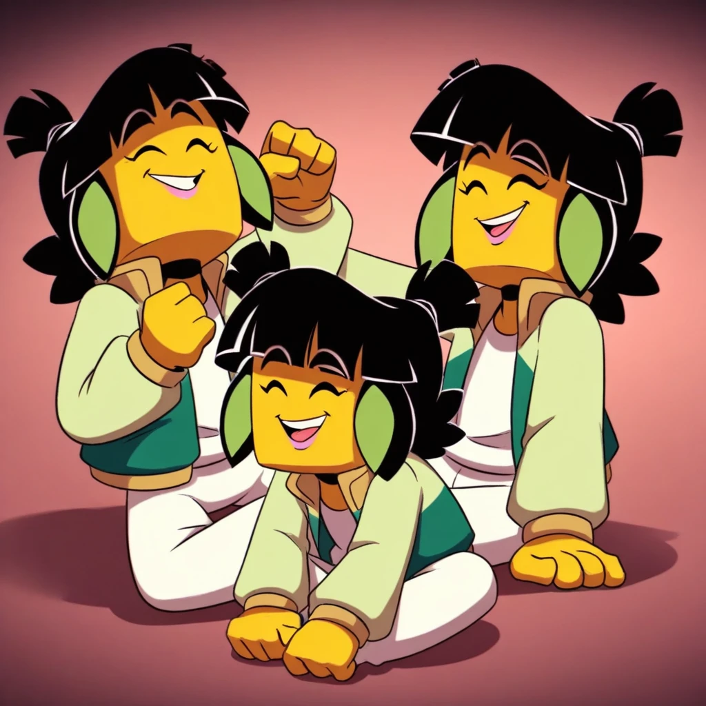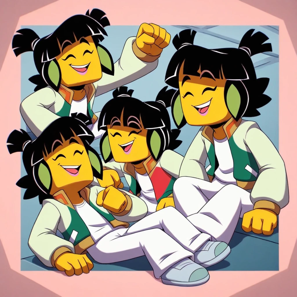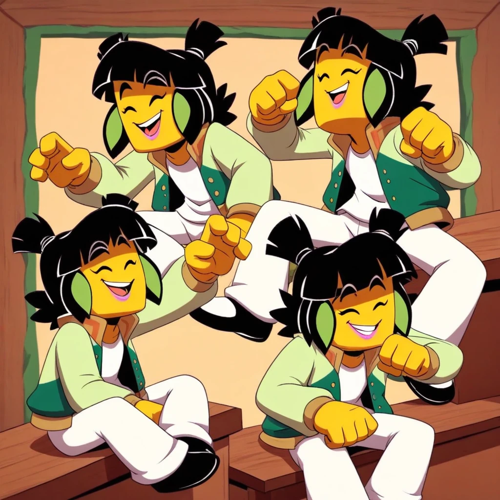 1girl, solo, female, Mei lmk, short black hair, two pigtails, straight bangs, yellow skin, colored skin,