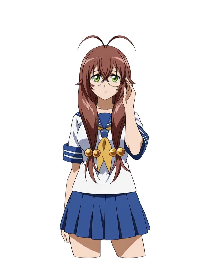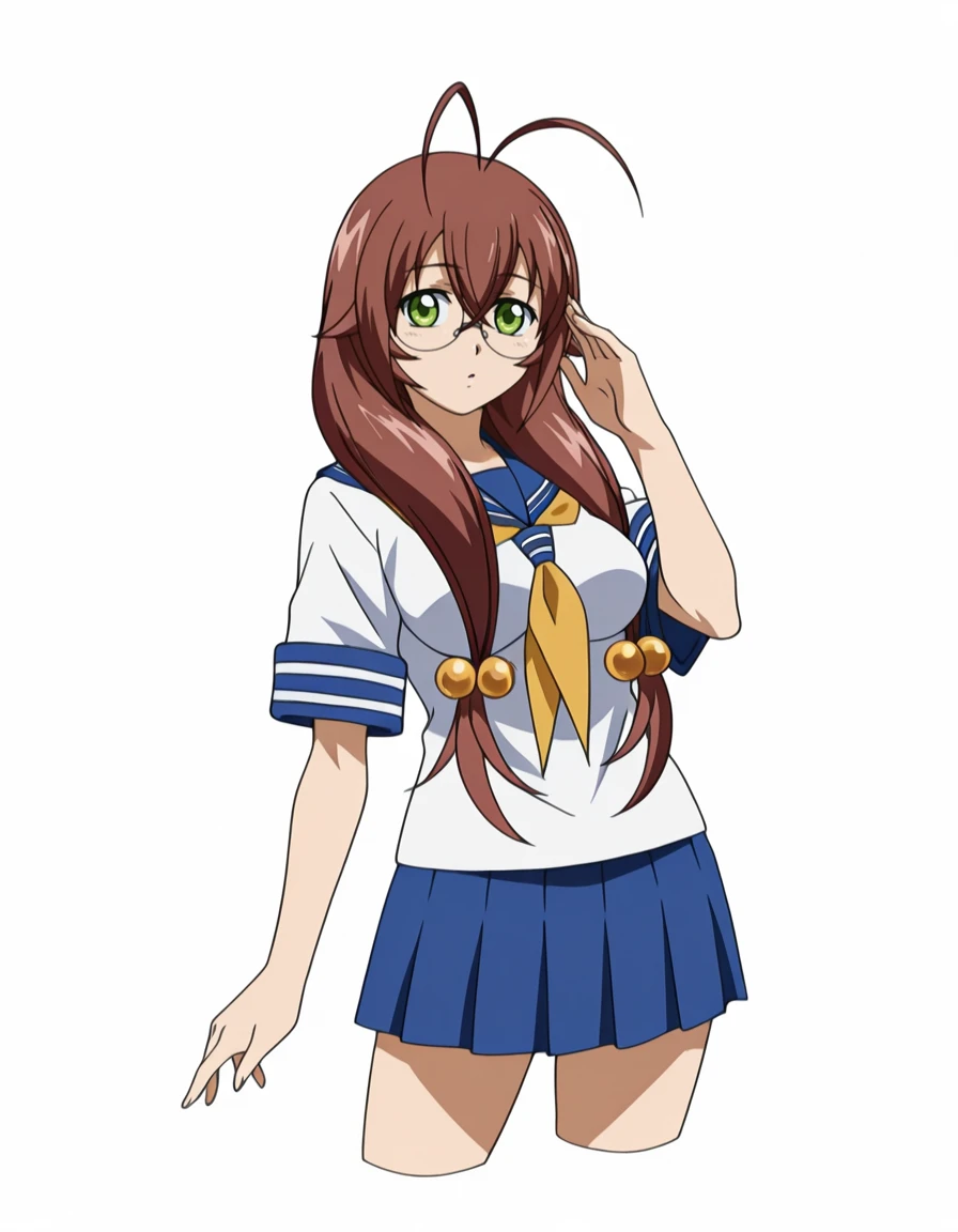 ryuub1g3nt0ku, 1girl, low-tied long hair, low twintails, antenna hair, hair boobles, brown hair, glasses, green eyes, shirt, sailor shirt, neckerchief, yellow neckerchief, medium breasts, short sleeves, skirt, blue skirt, pleated skirt