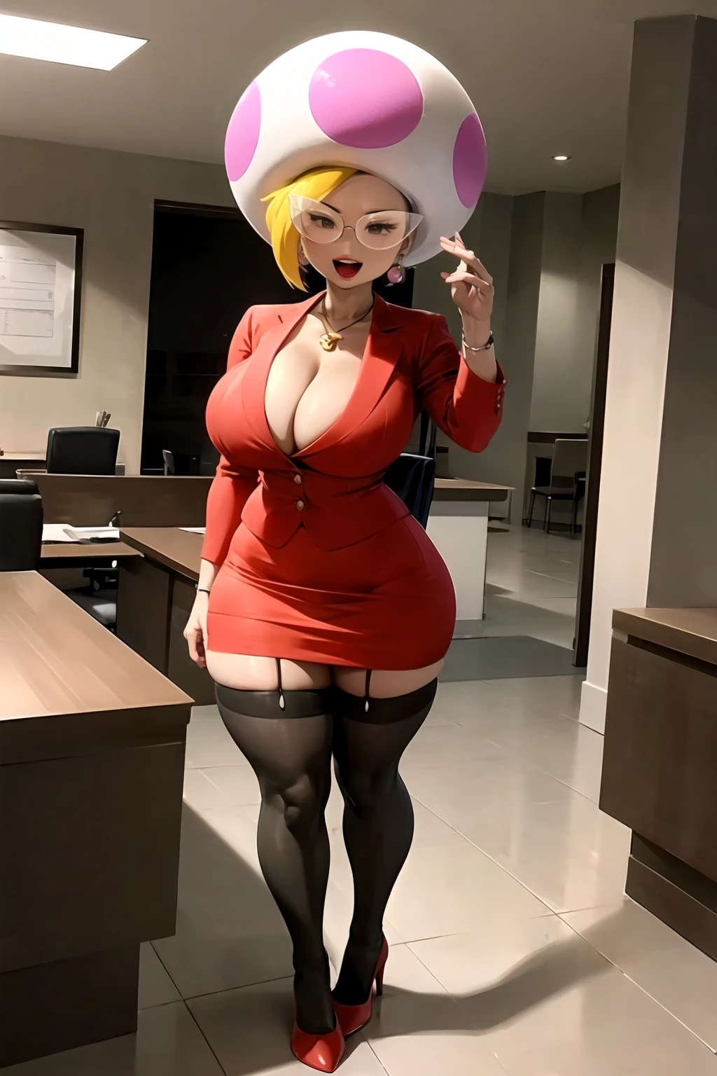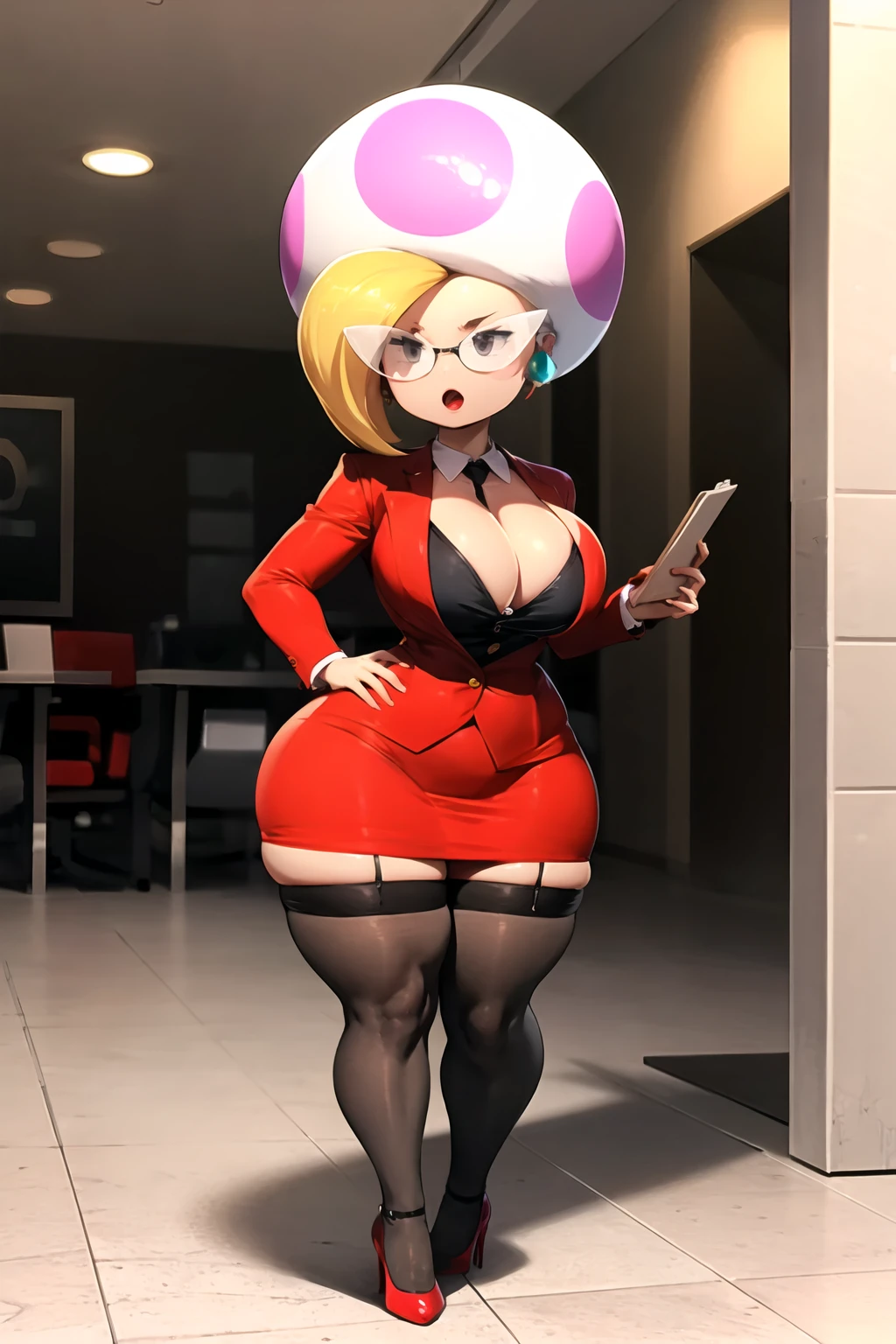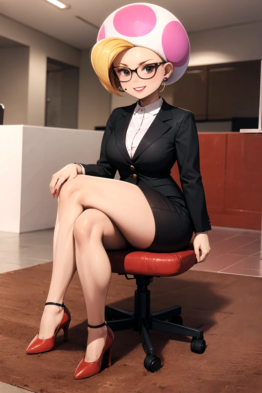 blonde hair, glasses, office lady, mushroom, lipstick, jolene (paper mario), toad (mario), mushroom humanoid, red lipstick, high heels, skirt, red footwear, pencil skirt, makeup, skirt suit, round eyewear, jacket, black eyes, suit, formal, miniskirt, short hair, smile