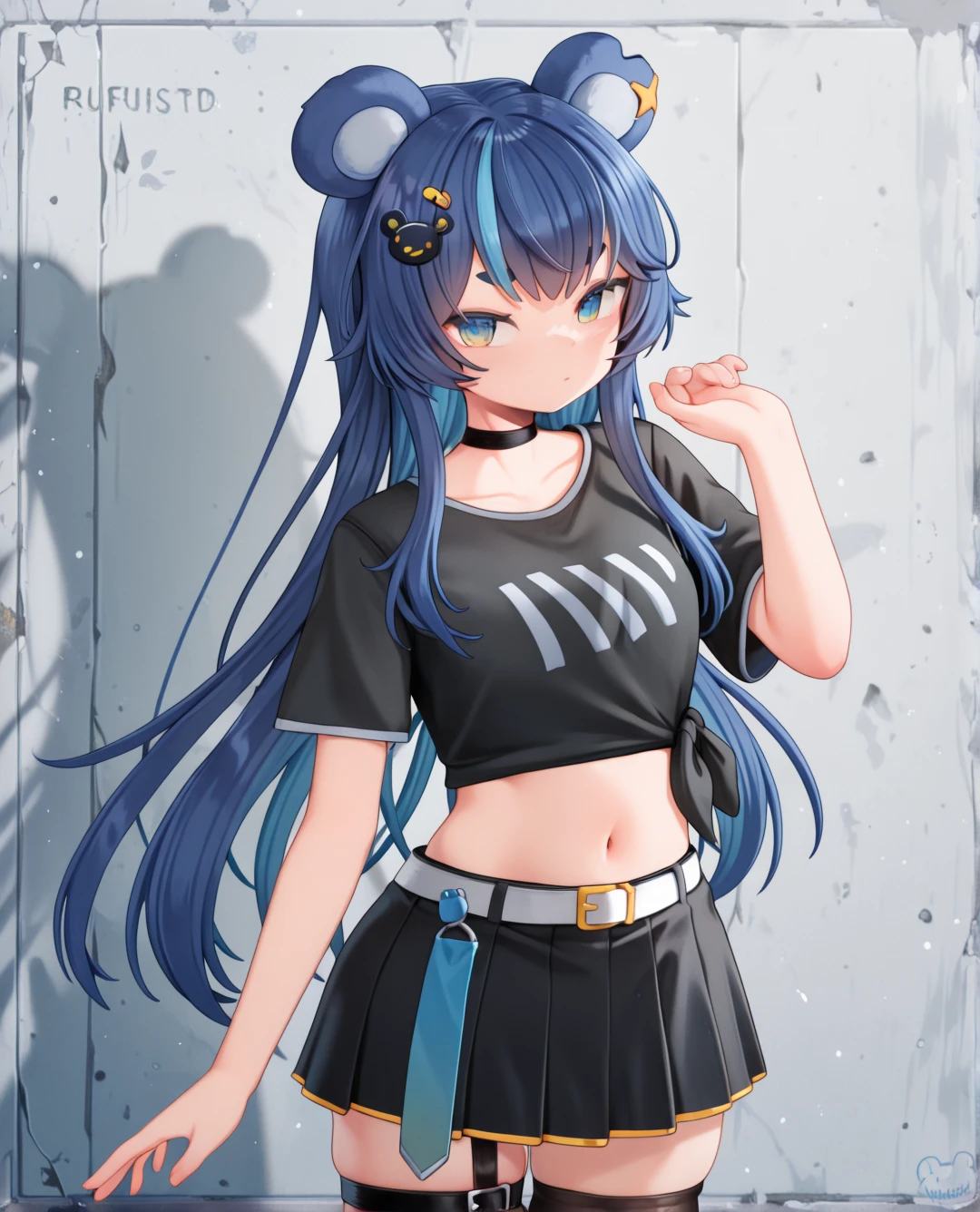uruka1st, long hair, black choker, crop top, black shirt, belt, black skirt, thigh strap, single thighhigh,