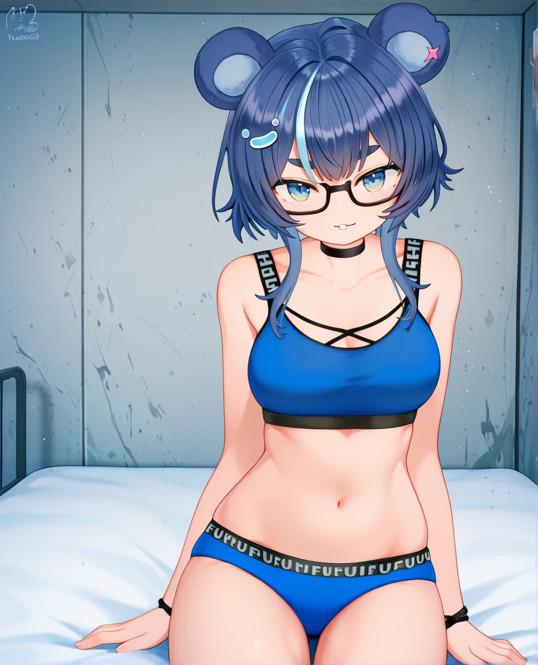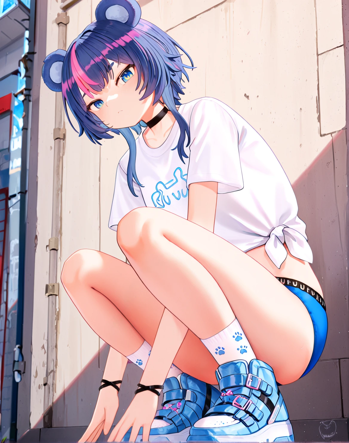 uruka3rd, wolf cut, pink streaks, (black-framed eyewear, buck teeth:1.1), (topknot, bangs pinned back, forehead:0), black choker, wristband, (blue sports bra:1), (white shirt, tied shirt, print shirt:0), (blue jacket, oversized jacket, zipper:0), (blue panties, underwear writing:1), (pink shorts, gym shorts drawstring:0), (bandaid on leg:0), (sneakers:0), (white socks:0),