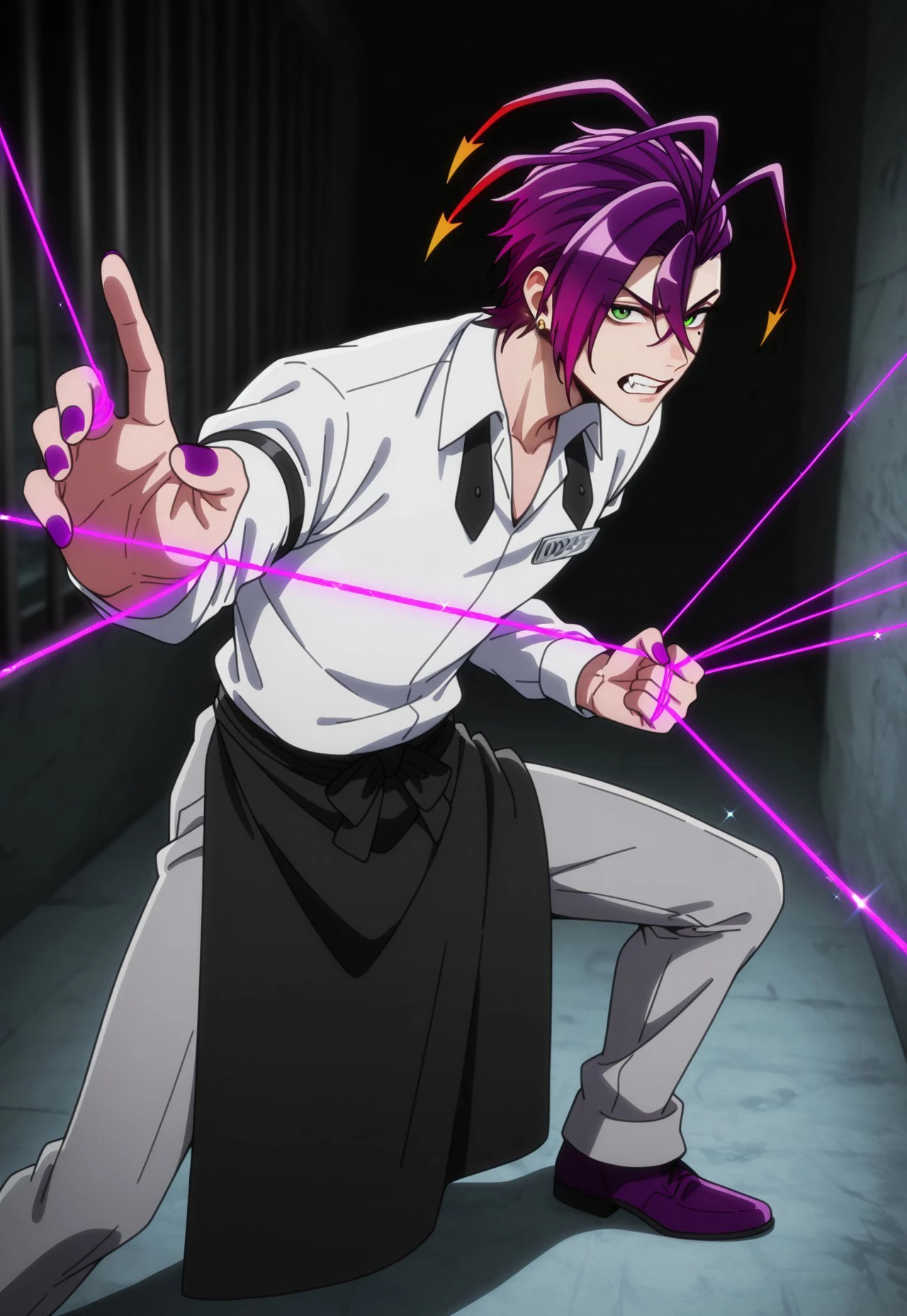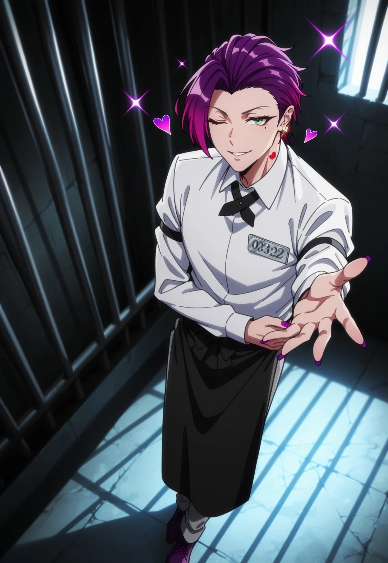 Honey is a flashy and unpredictable inmate from Building 5 in Nanbaka, known for his eccentric style, sharp tongue, and explosive personality. He’s obsessed with looking cool and despises anything he considers ugly or lame. While he often acts laid-back and smug, his mood can flip instantly—turning him into a foul-mouthed, hot-headed fighter when provoked. His hair will spike up, visually symbolizing his explosive temper.