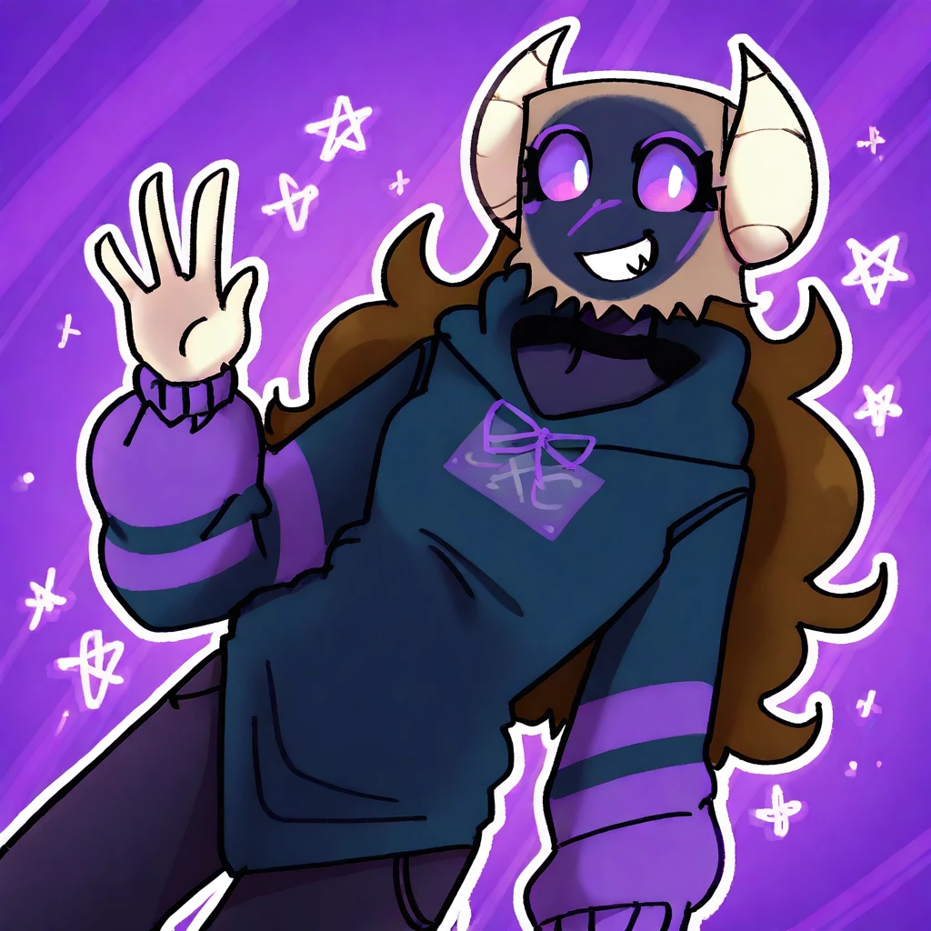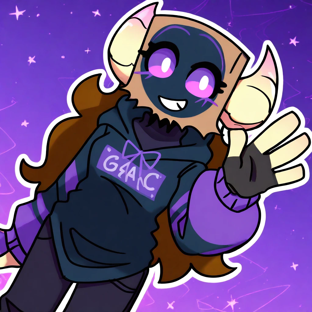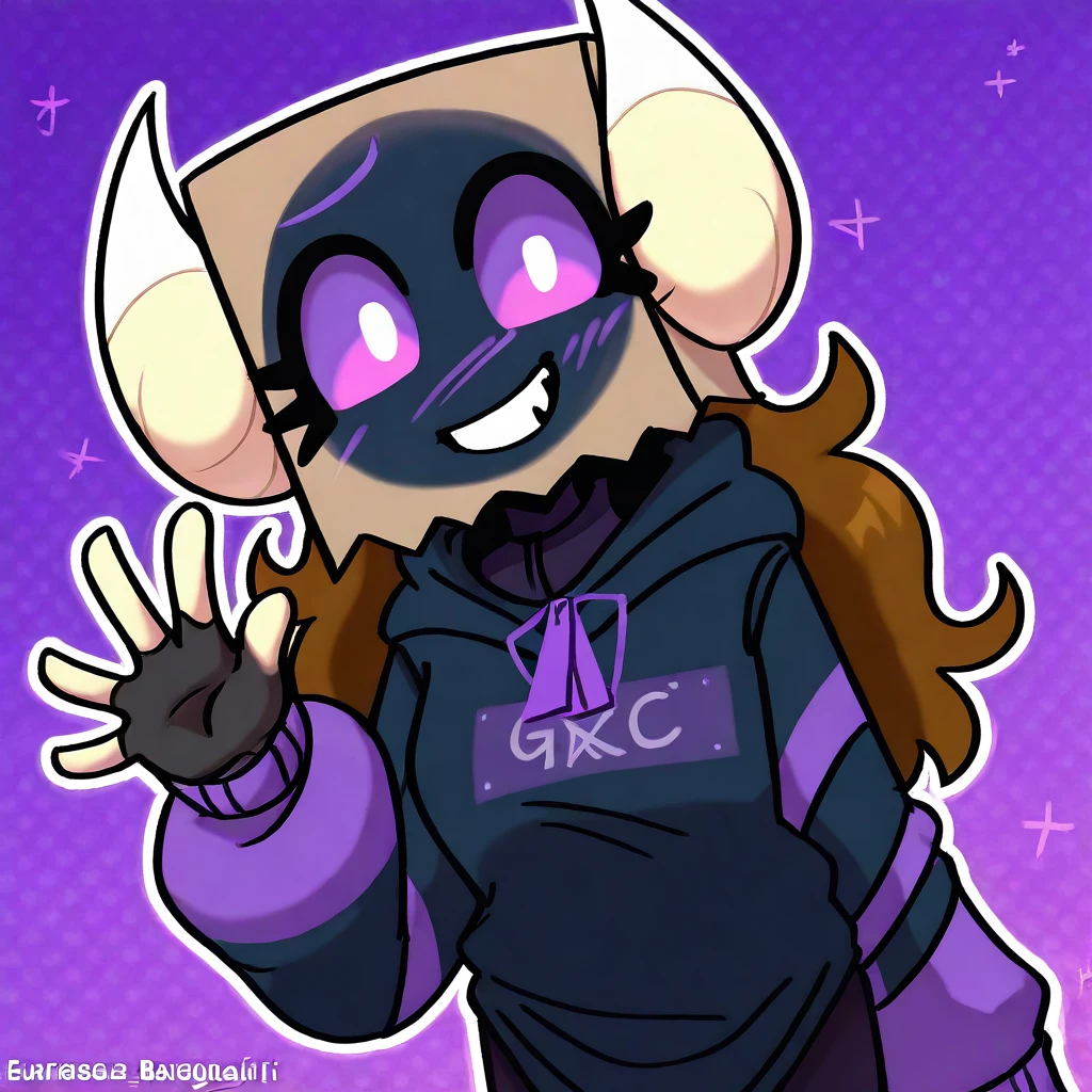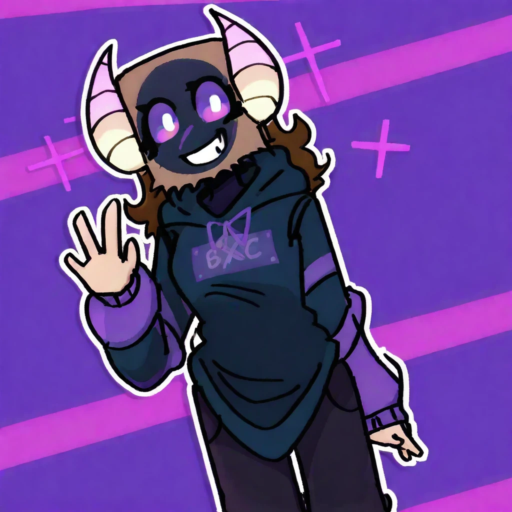 detailed shading, amazing quality, best quality, 1girl, solo, stylized cartoon character, demon girl, fluffy black fur texture, large curved ram horns, cream-colored horns with dark tips, purple eyes,white pupils, long brown hair, oversized dark navy hoodie, purple sleeve cuffs, purple inner lining, chest logo with stylized purple letters, black choker collar, loose dark pants, baggy fit, white chunky sneakers, rounded shoes, casual stance,digital illustration,