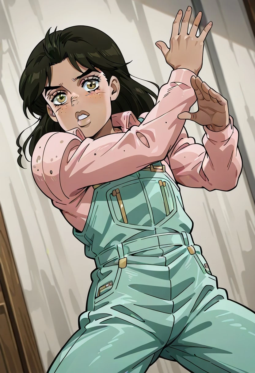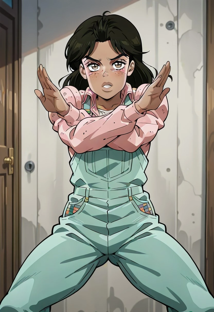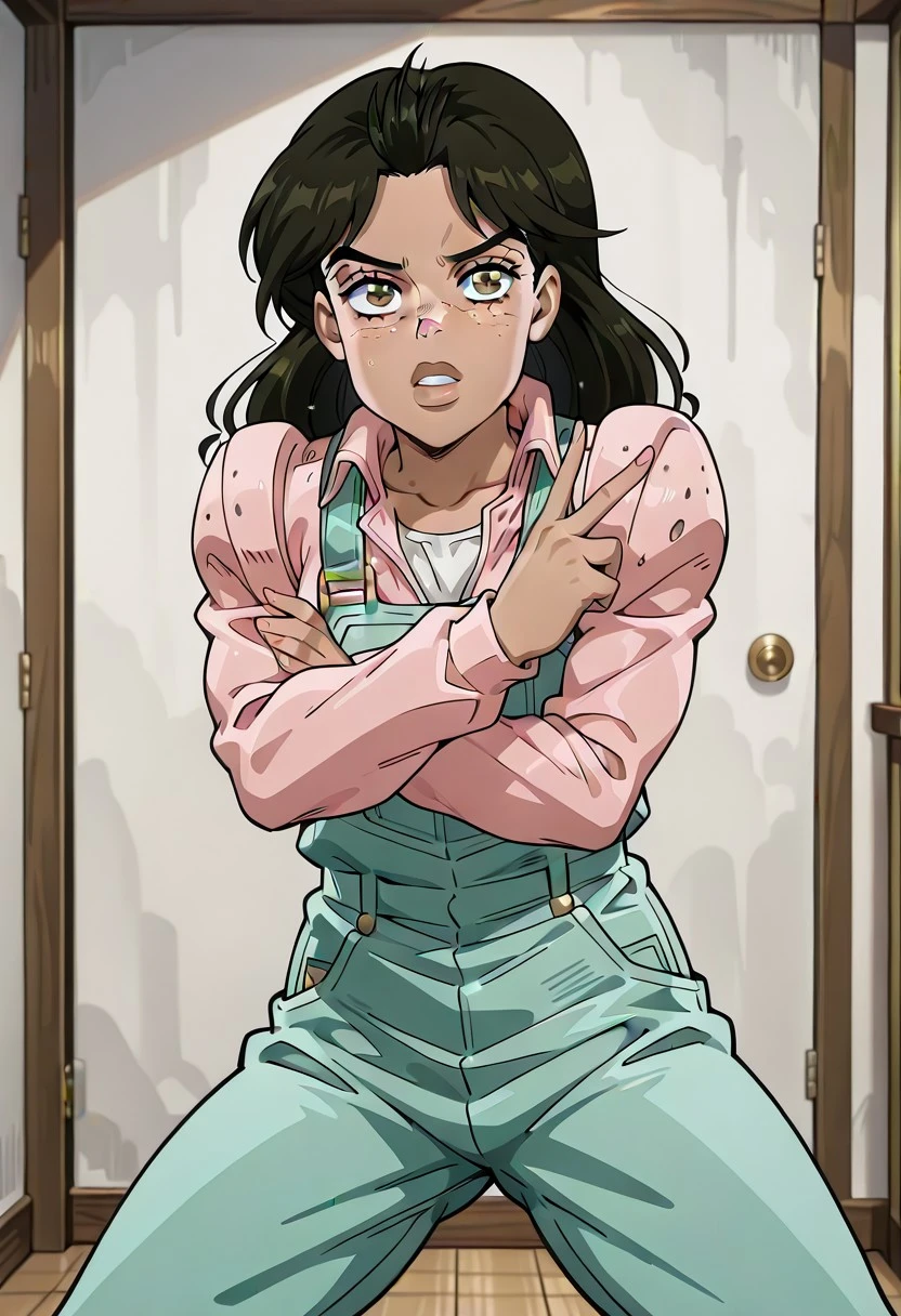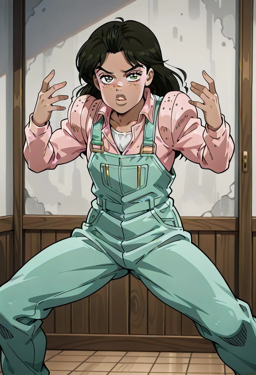 ANNEJojo, hazel eyes, black hair, tanned skin, freckles, slight upturned nose, tomboy, pink shirt, green overalls,