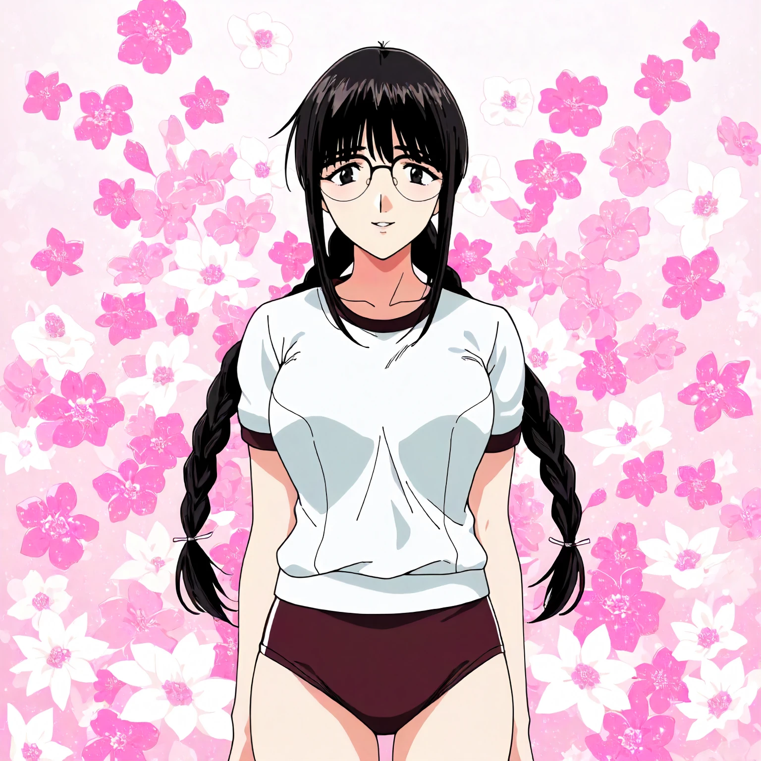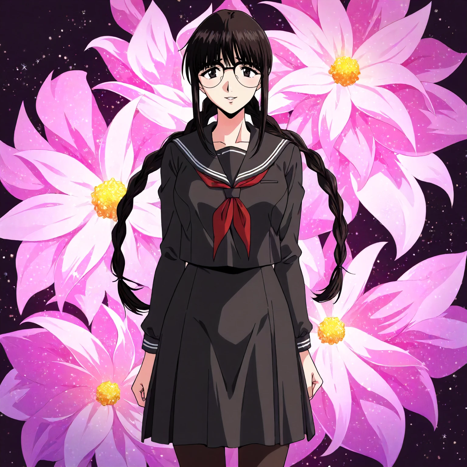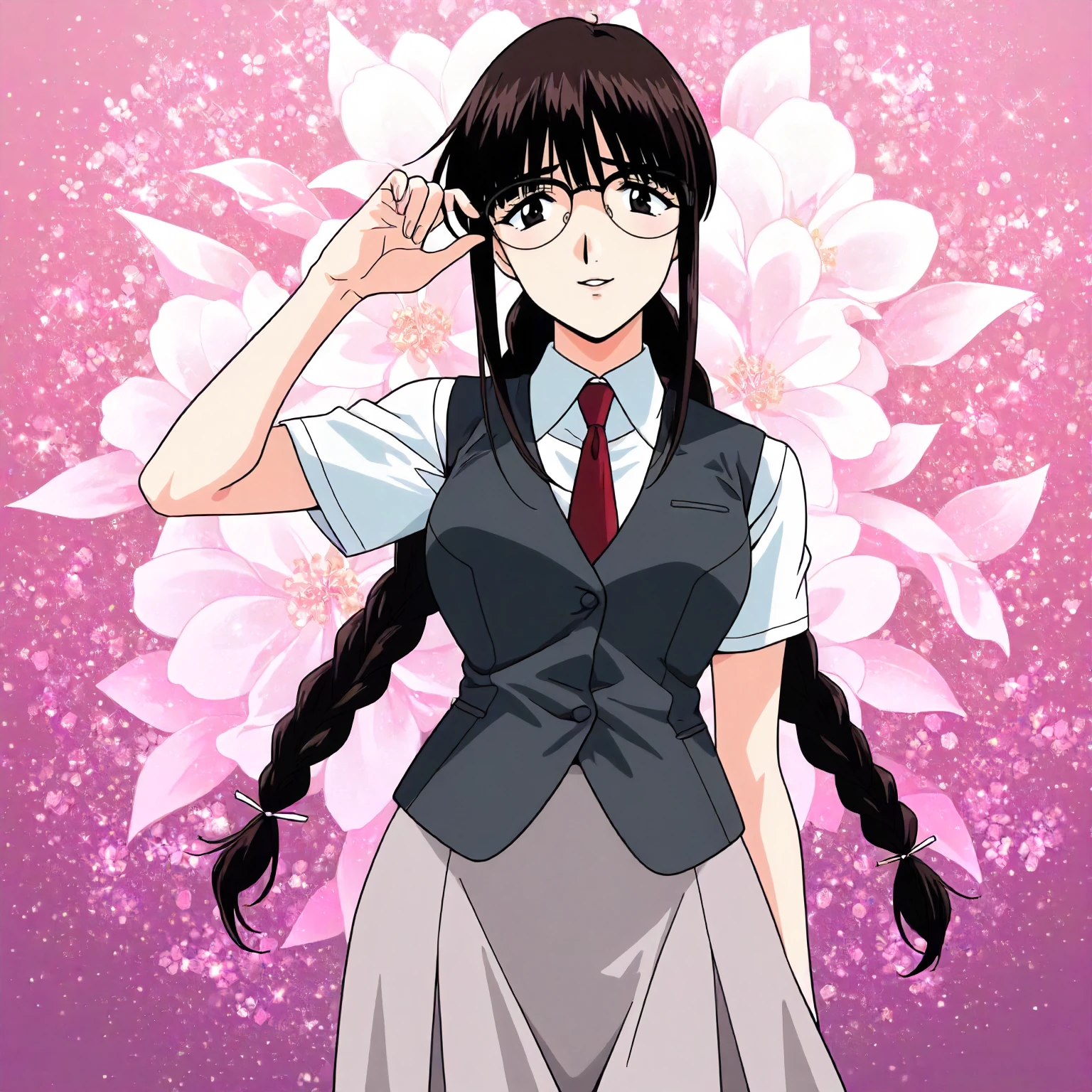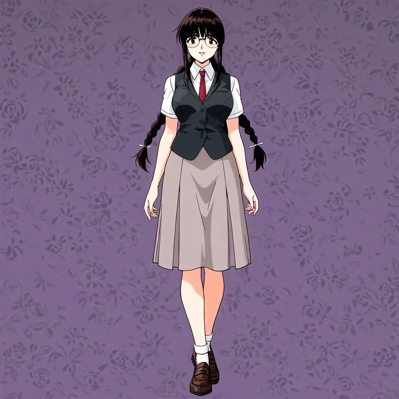 anime coloring, someya_kiyoko\(hexa\),1girl,brown black hair,twin braids,sidelocks,black eyes, glasses,