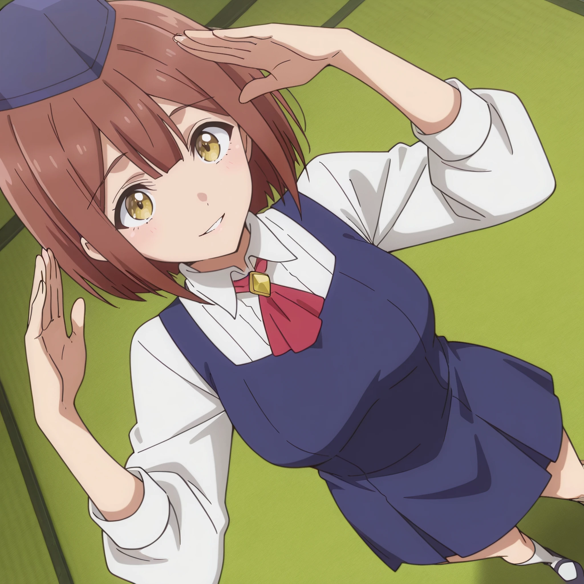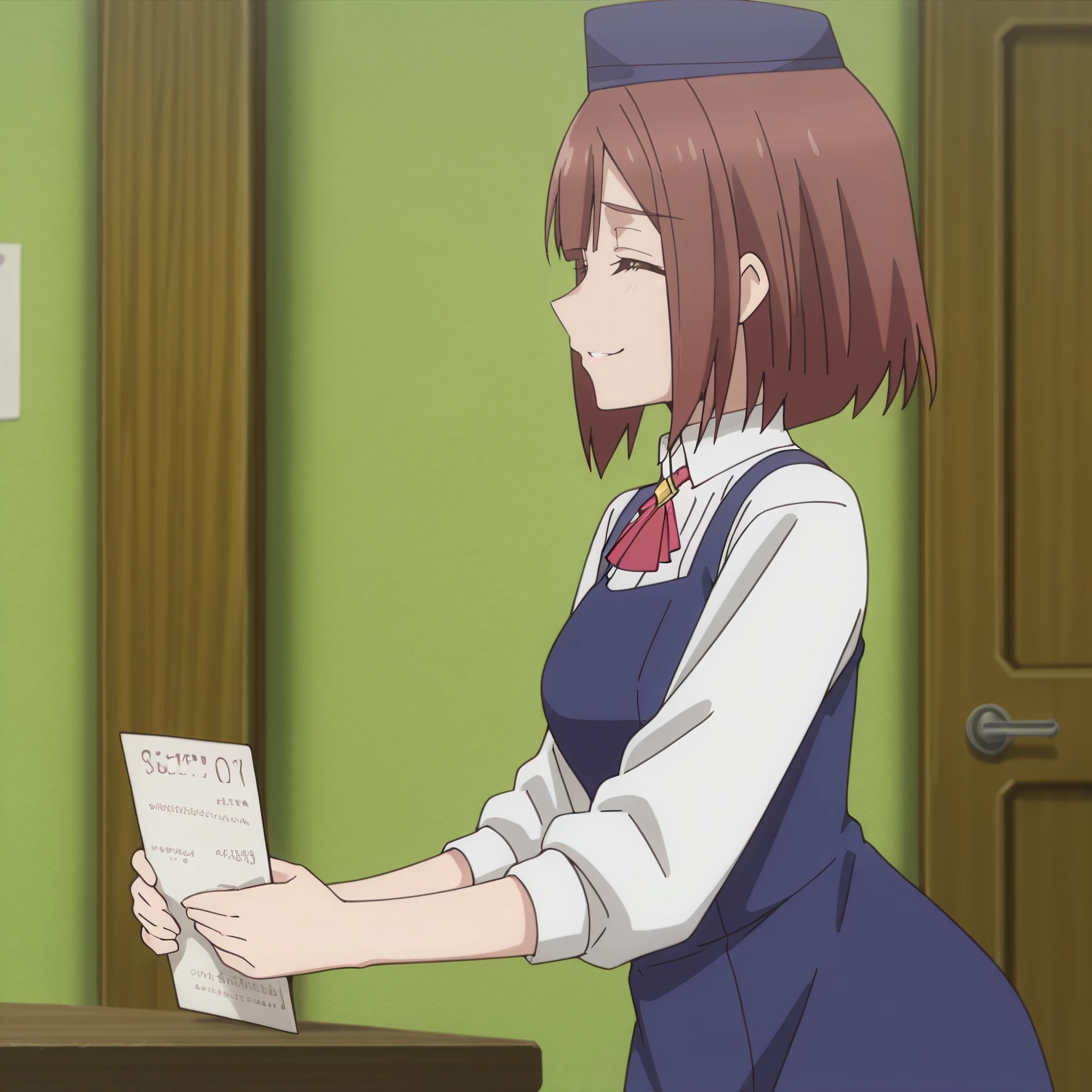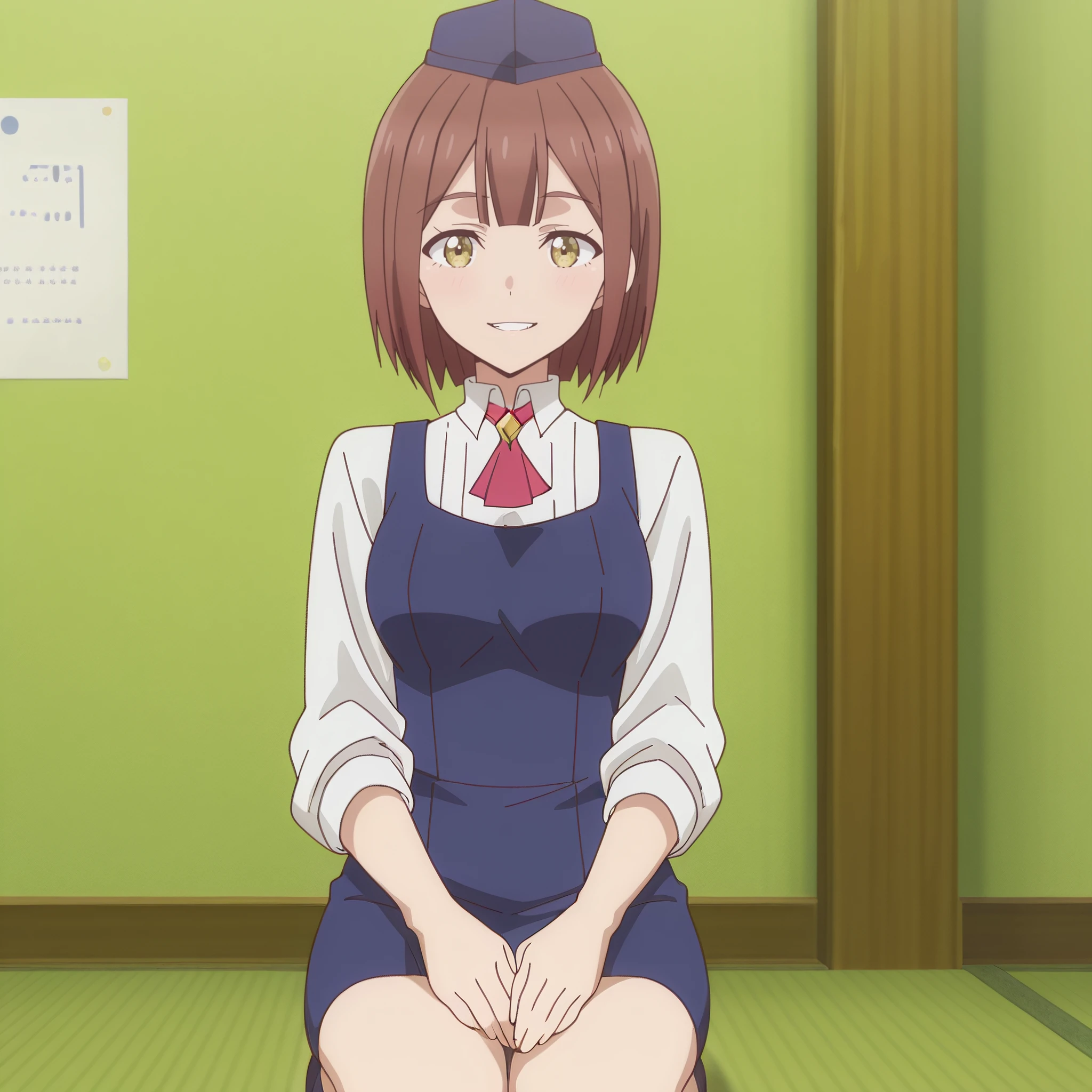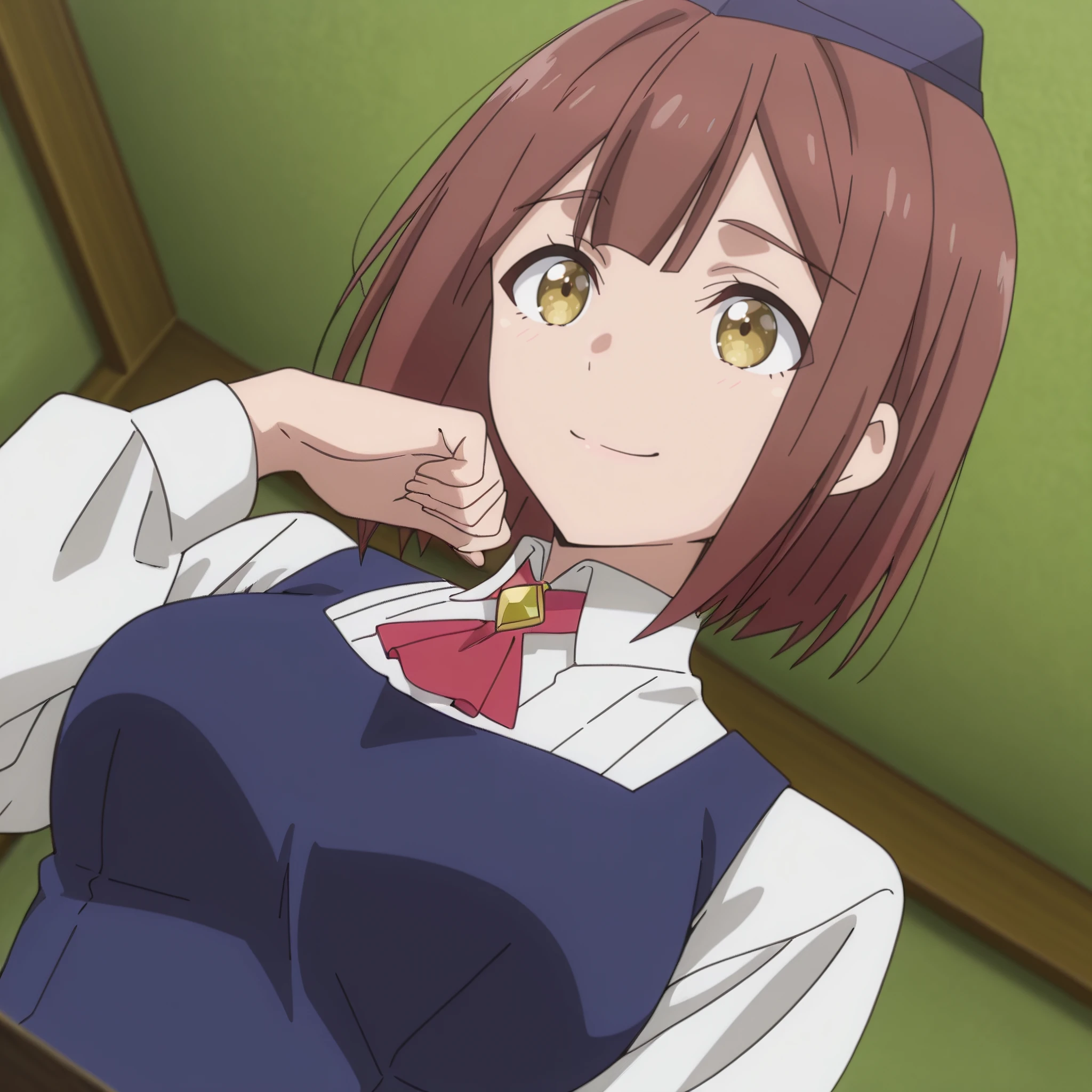 SRAReceptionist, brown hair, short hair, yellow eyes,