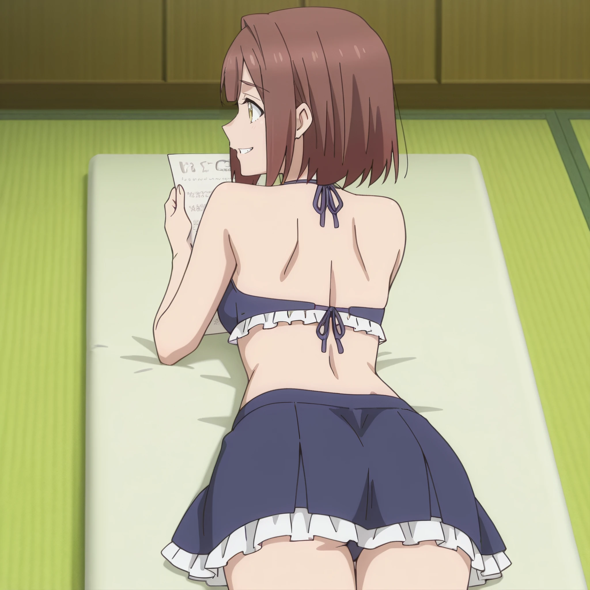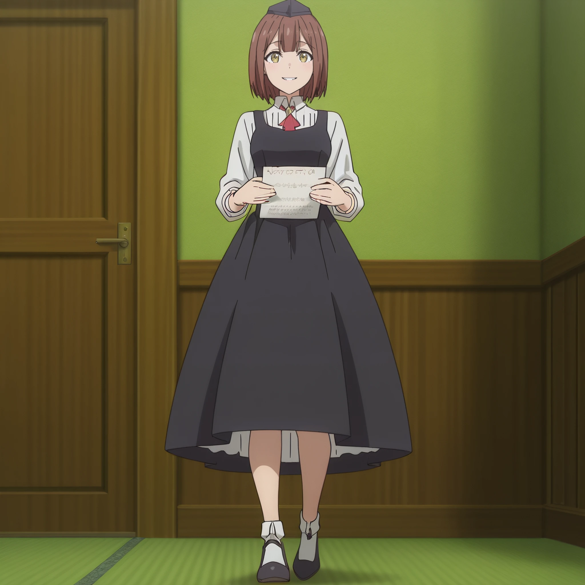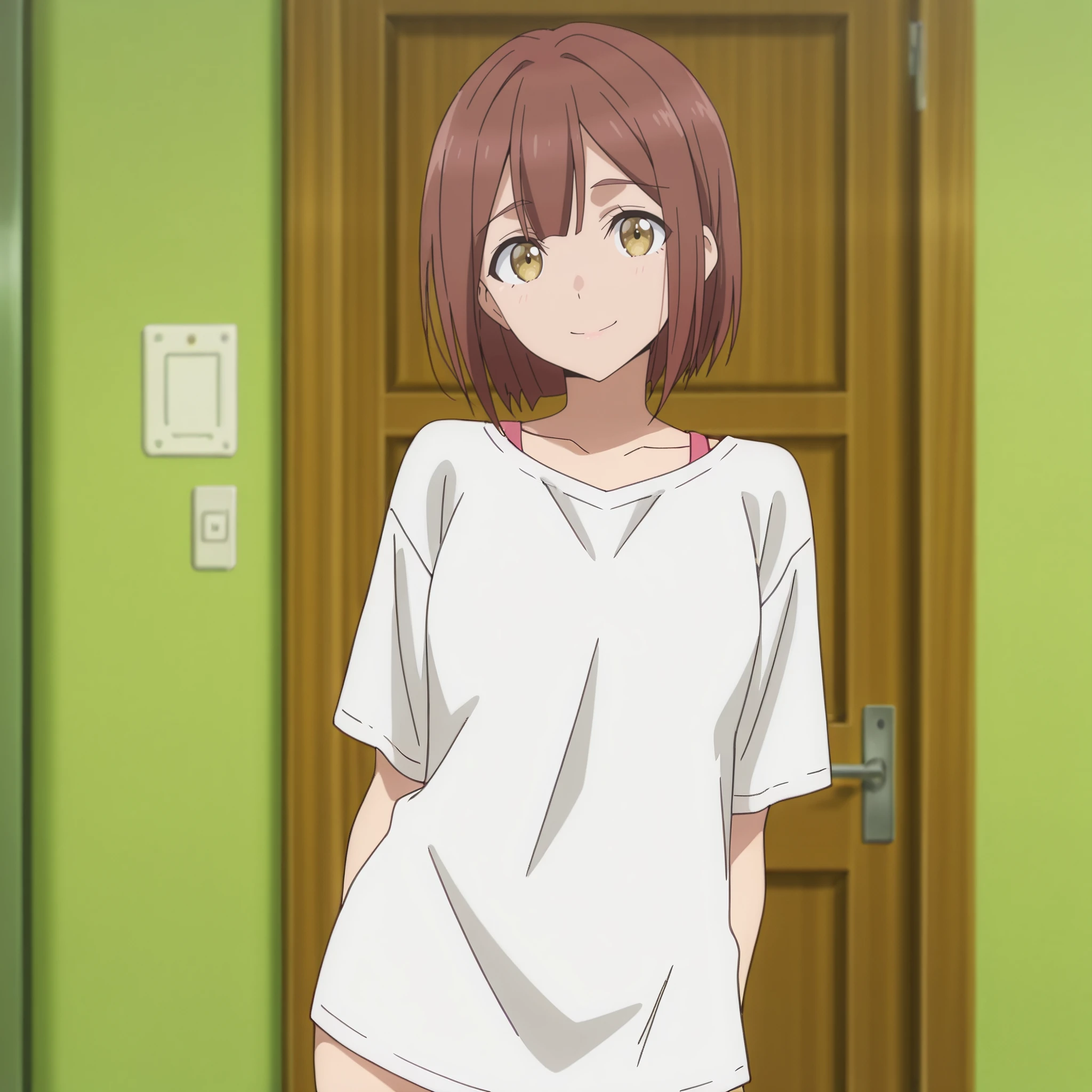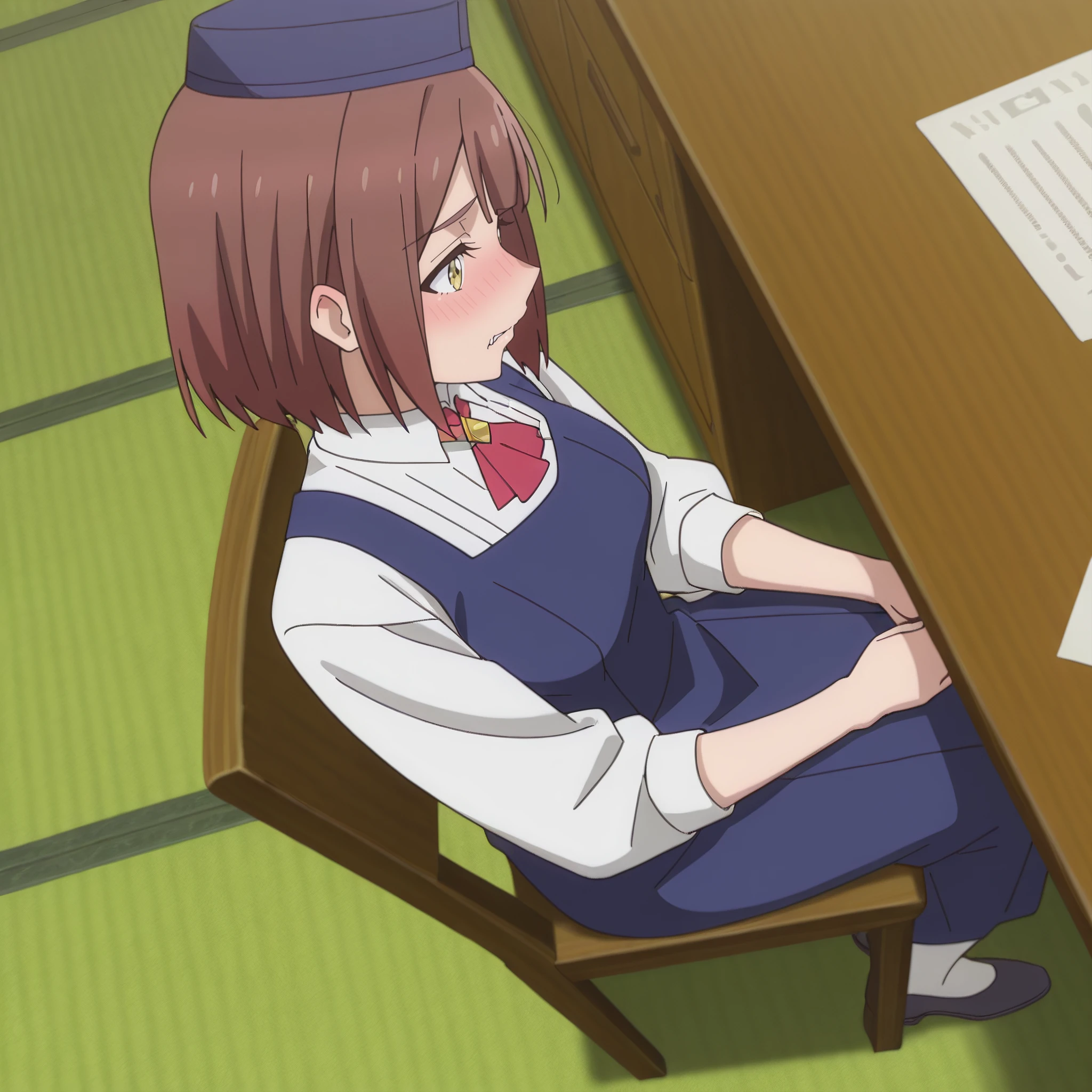SRAReceptionist, brown hair, short hair, yellow eyes,