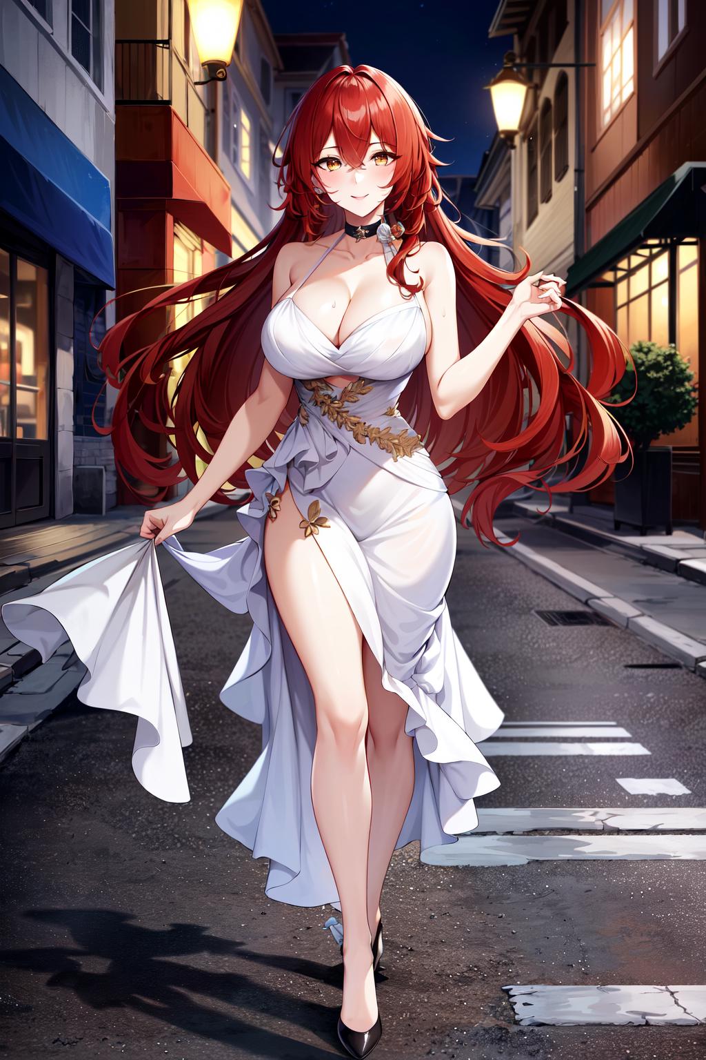 • To summon her use the trigger Tags plus following tags: solo, red hair, long hair, looking at viewer, breasts, bangs, yellow eyes, smile, dress, white dress, hair between eyes, cleavage, closed mouth