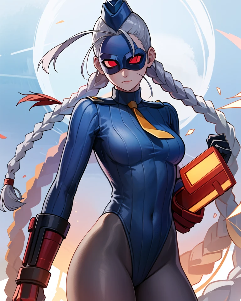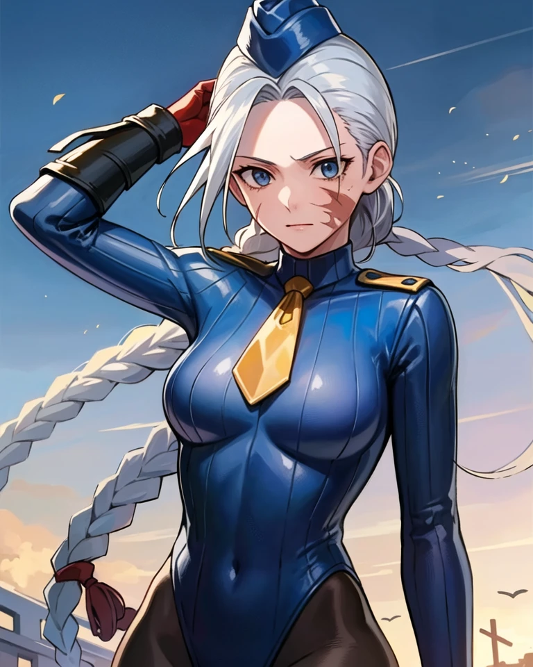 decaprems, garrison cap, hat, leotard, necktie, scar, white hair, bodysuit, mask, red eyes