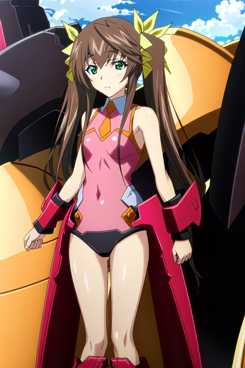 Huang Lingyin, Rin, 1girl, solo, twintails, long hair, green eyes, brown hair, pilot suit, leotard, covered navel, ribbon, mecha musume, hair ribbon, pink leotard, bare shoulders