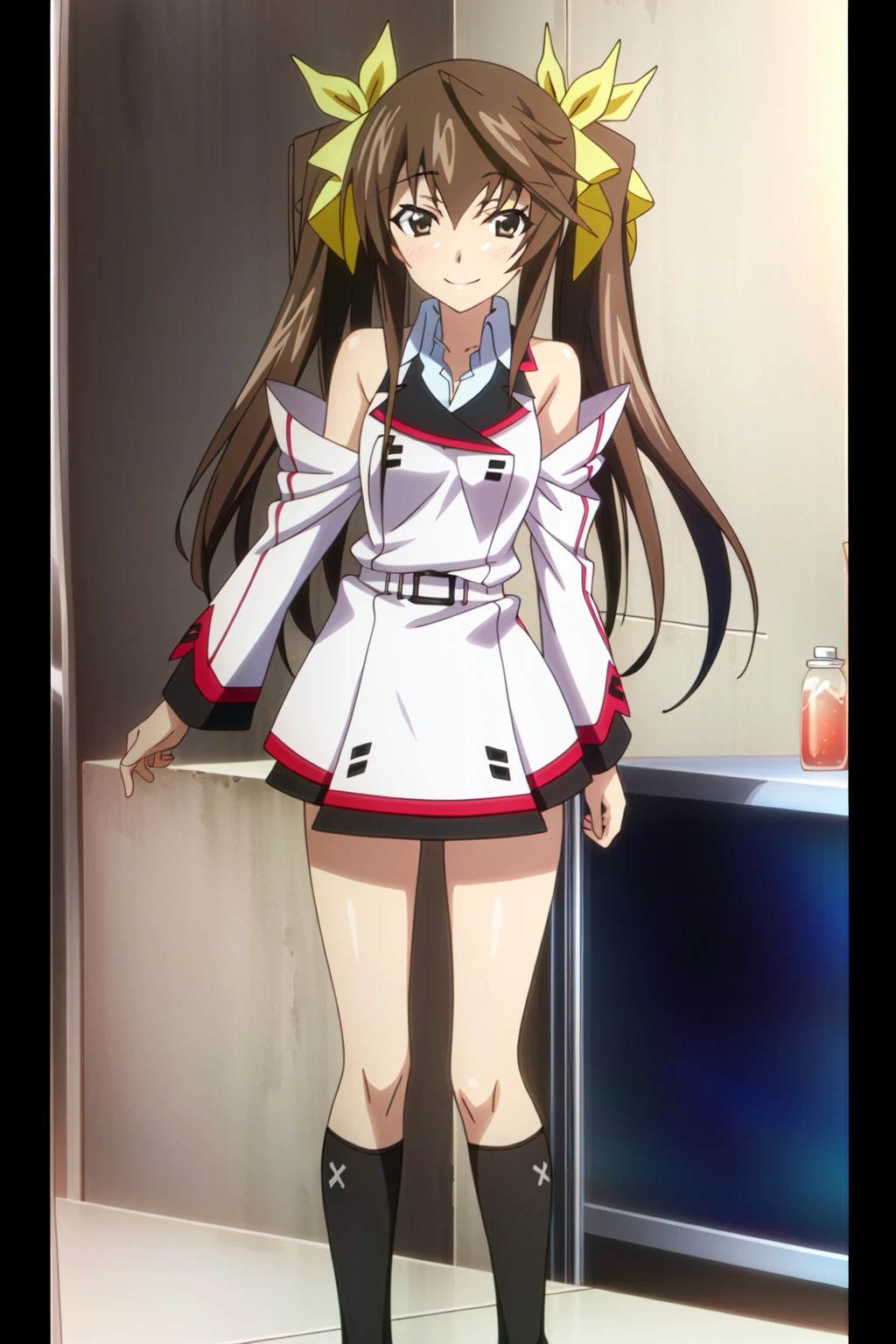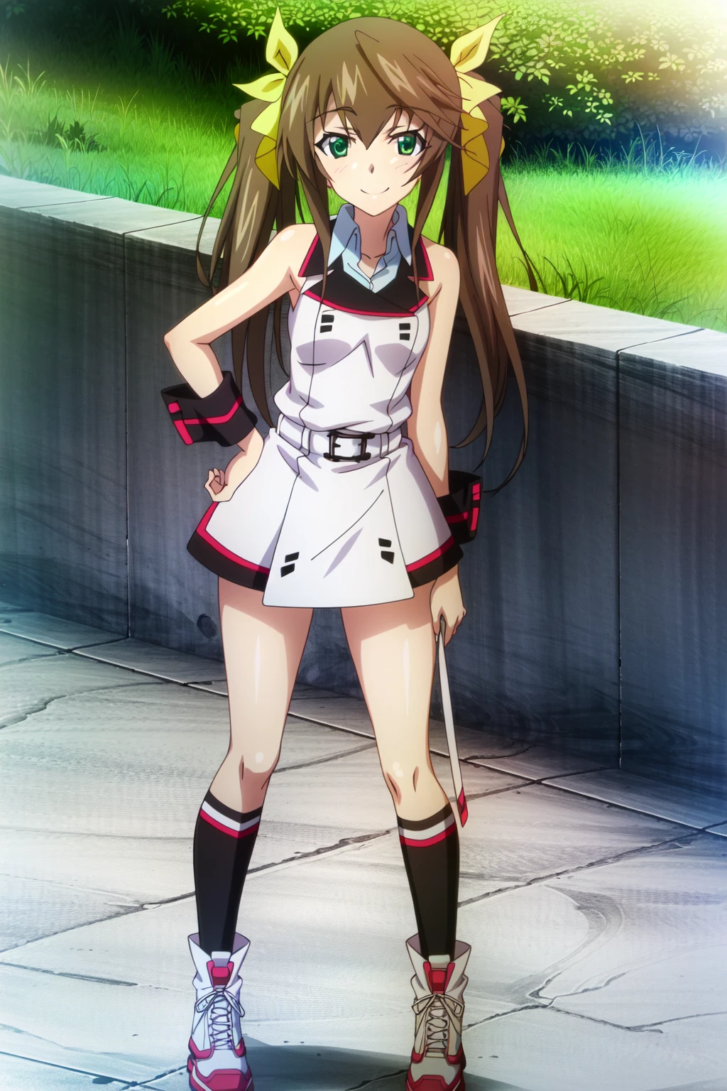 Huang Lingyin, Rin, 1girl, solo, twintails, brown hair, long hair, green eyes, smile, ribbon, hair ribbon, socks, hand on hip, boots, kneehighs, black socks, looking at viewer, yellow ribbon, belt