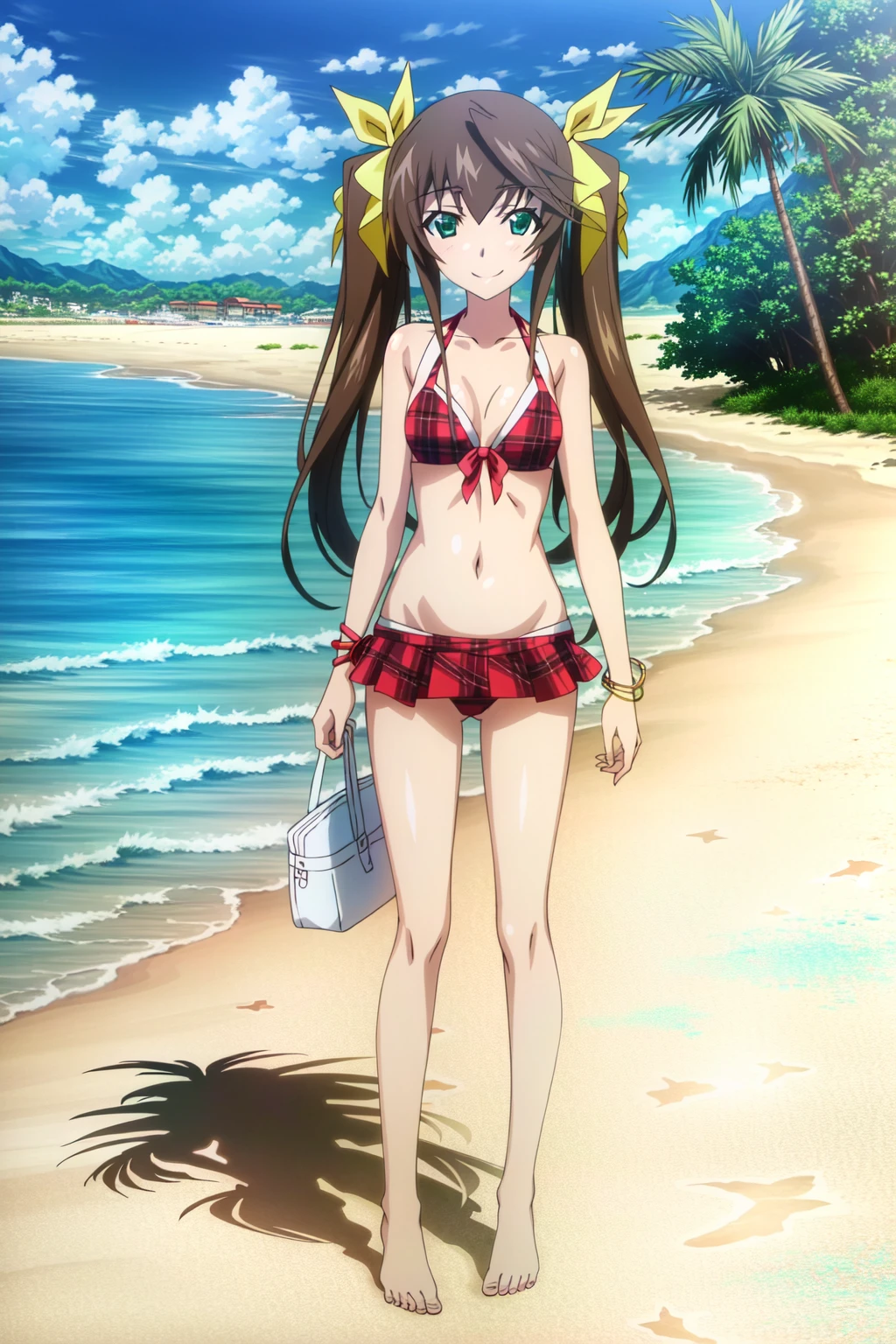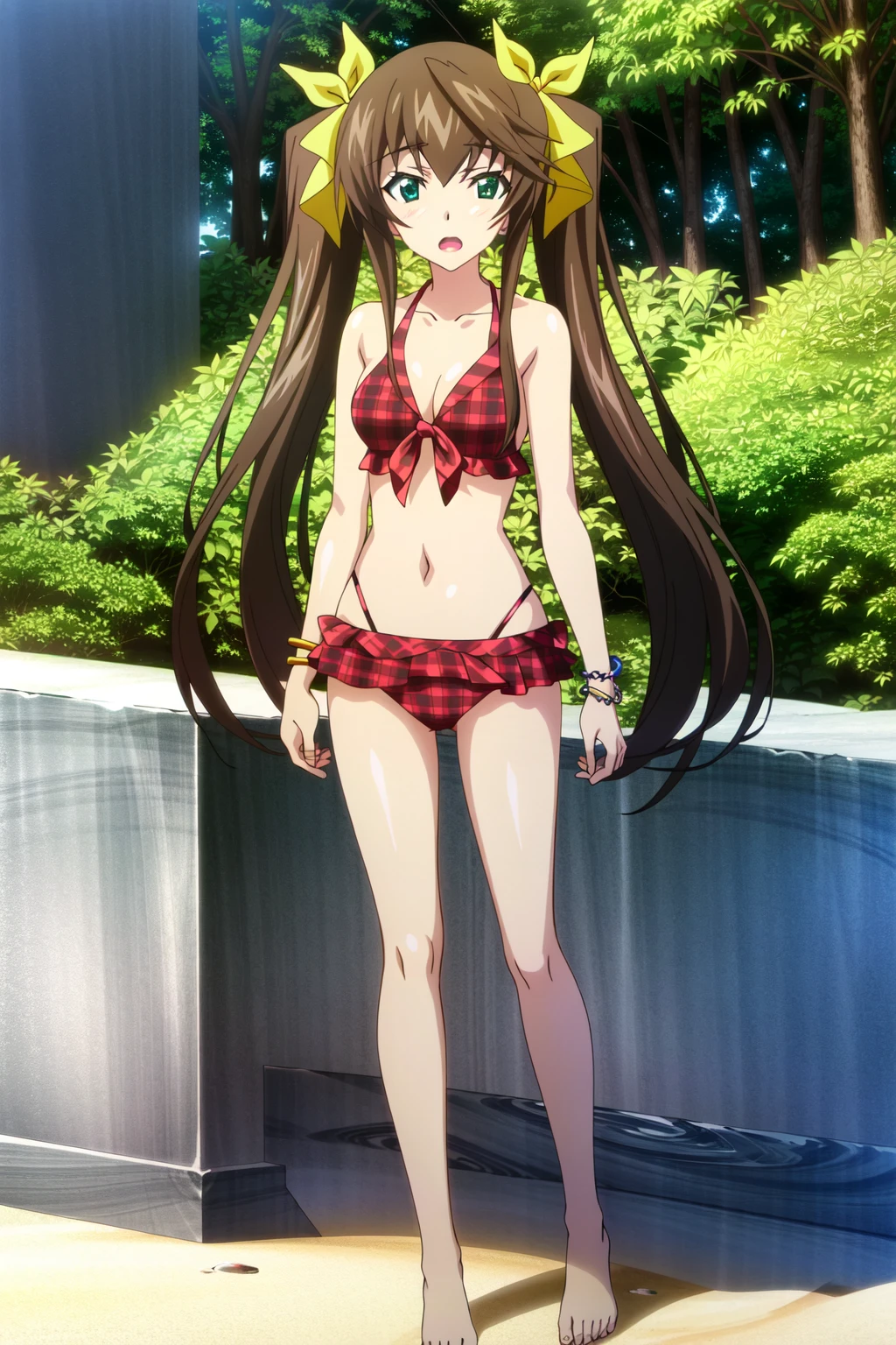 Huang Lingyin, Rin, 1girl, solo, twintails, brown hair, green eyes, long hair, ribbon, hair ribbon, smile, orange swimsuit, bracelet, jewelry