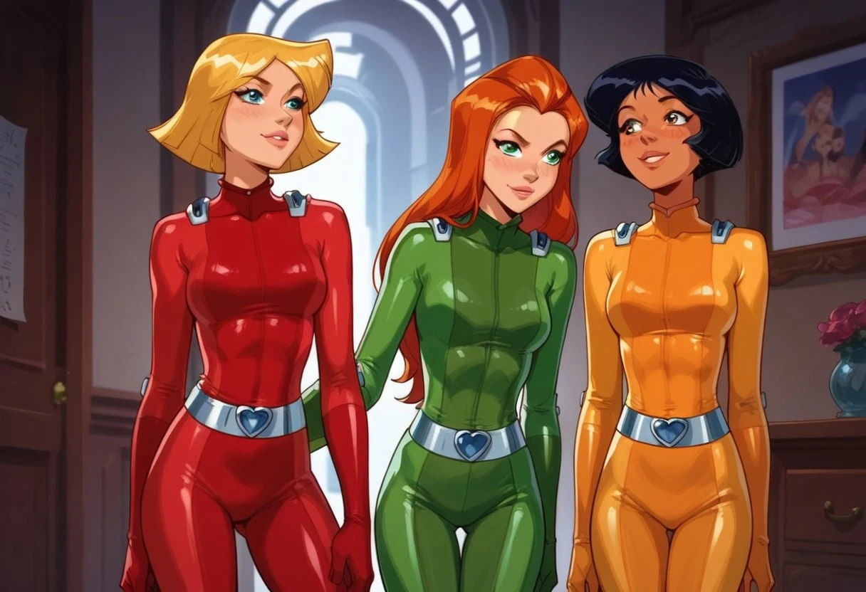3girls, multiple girls, \(totally spies\), (samts orange hair, green eyes, long hair, green bodysuit), (cloverts, short hair blonde hair, blue eyes, red bodysuit,), (alexts, short hair, brown hair, brown eyes, yellow bodysuit, ),