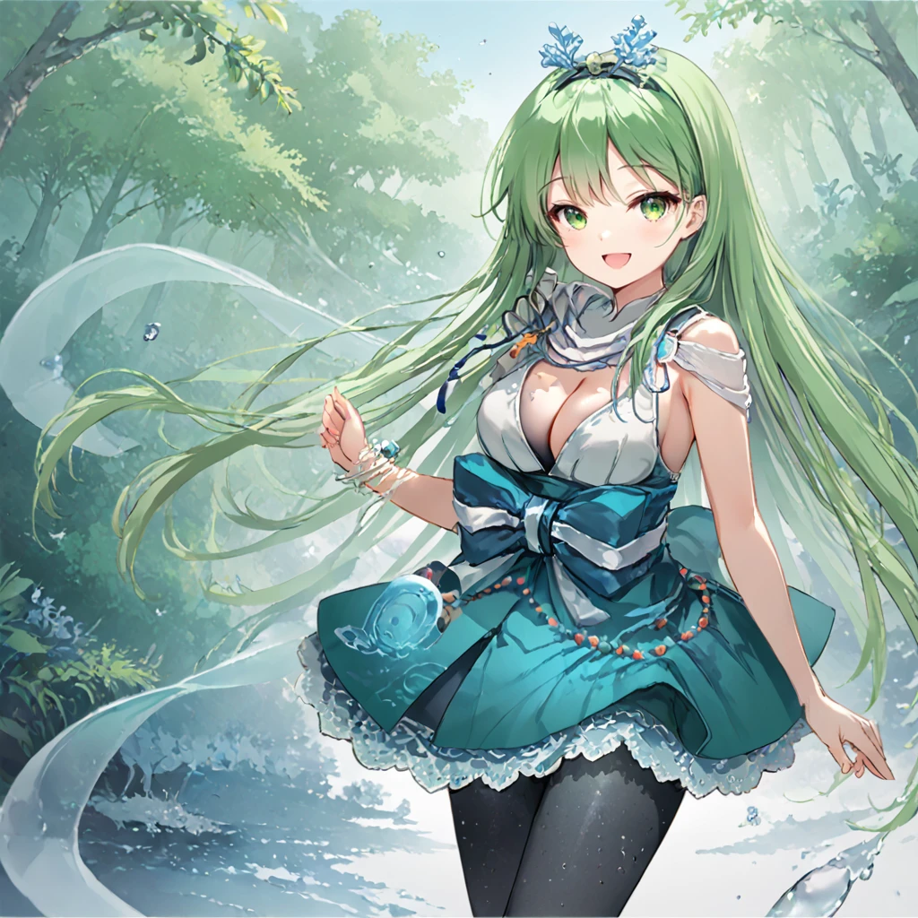 miko outfit, white dress, green skirt, black pantyhose, cleavage, hairband,Extra info: