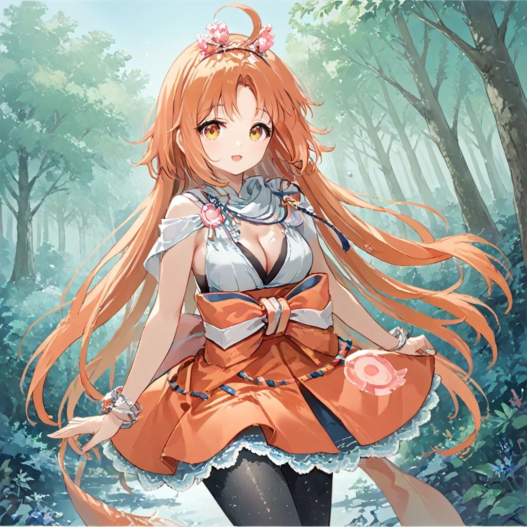 miko outfit, white dress, orange skirt, black pantyhose, cleavage, hairband,Chikagi