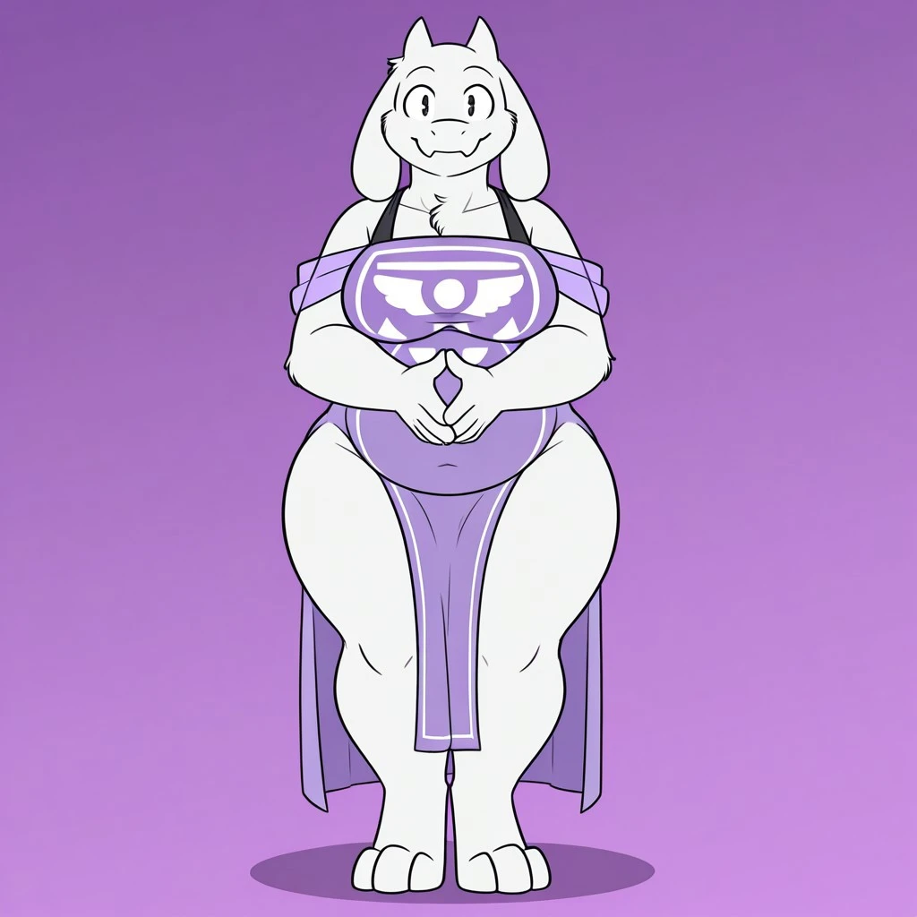 goat, goat girl, monster girl, white fur, black eyes, goat horns, goat ears, fangs, large breasts, slightly chubby, thick thighs, wide hips, purple dress, black shoulder straps, Pelvic curtain,