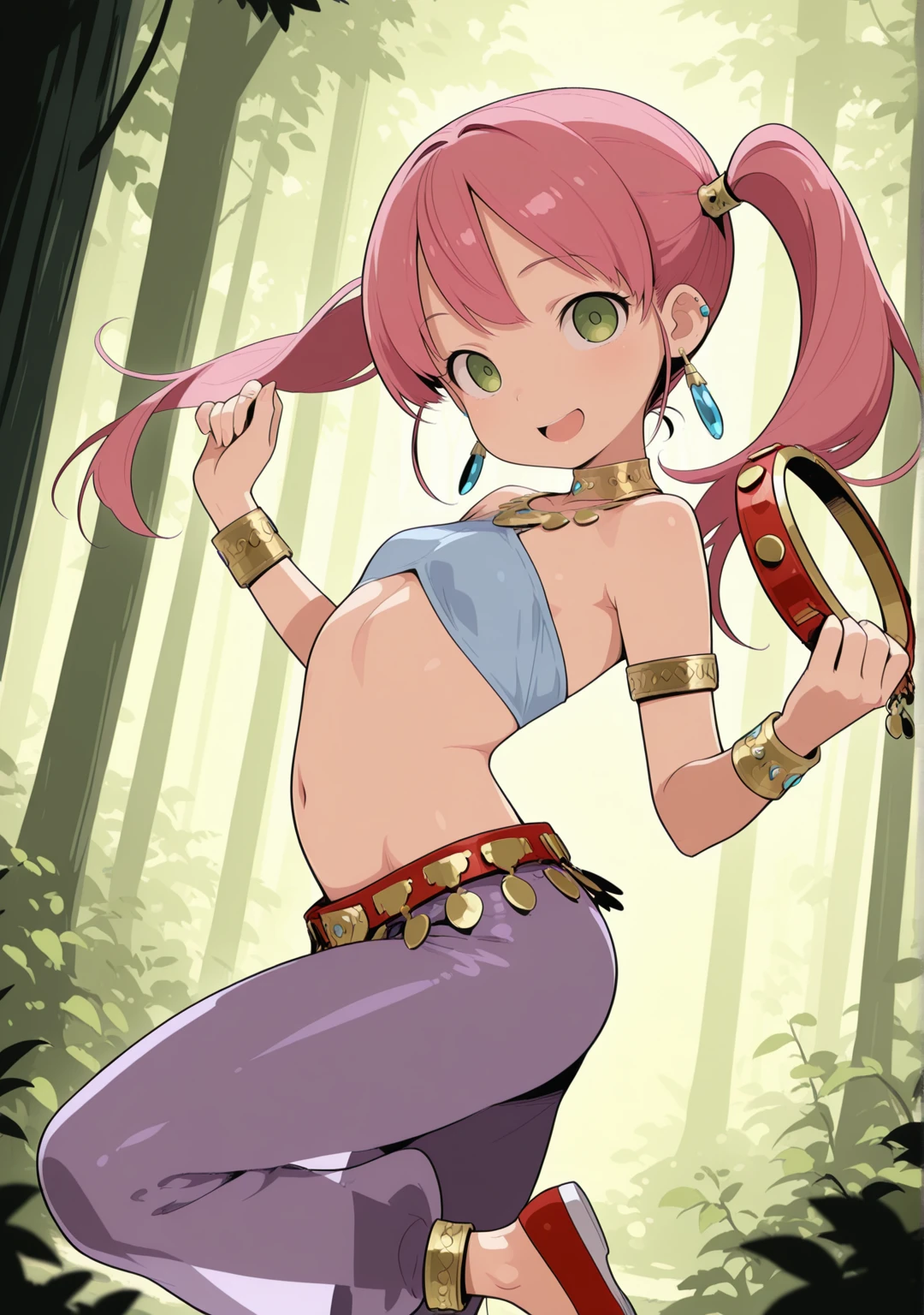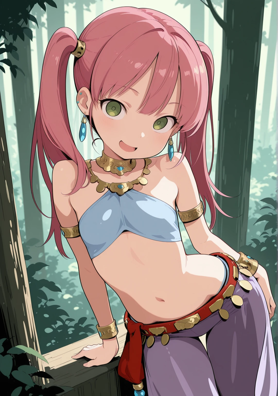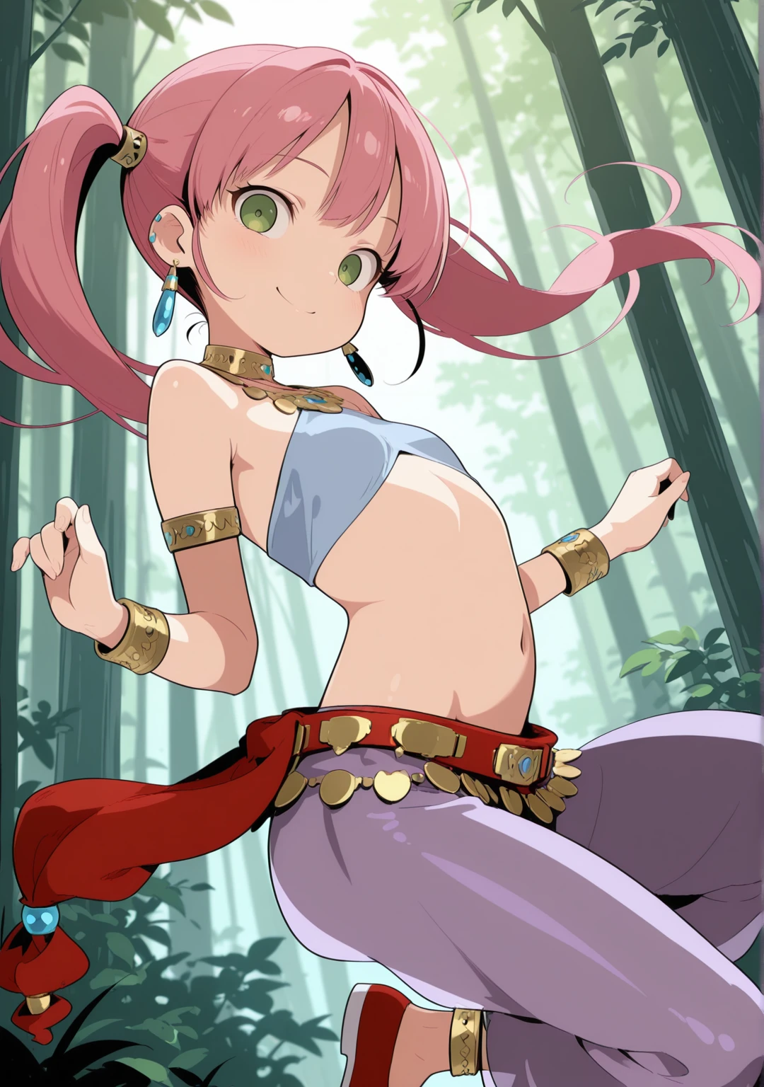 recommend:pink hair,green eyes,twintails,armlet,bare shoulders,belt,bracelet,anklet,arabian clothes,crop top,halterneck,harem outfit,neck ring,necklace,earrings,harem pants,jewelry,long hair,navel,purple pants,red footwear,see-through,shoes,