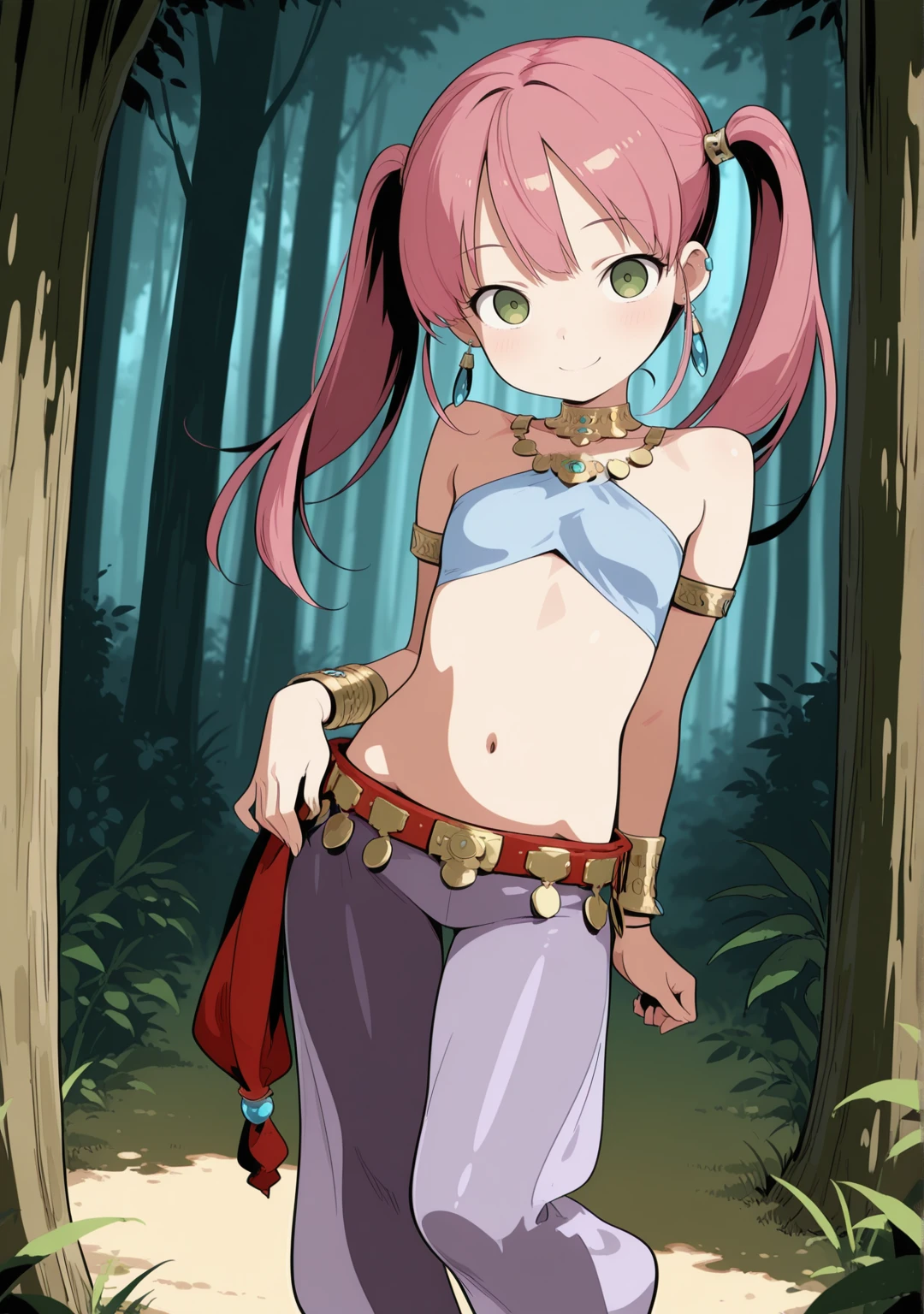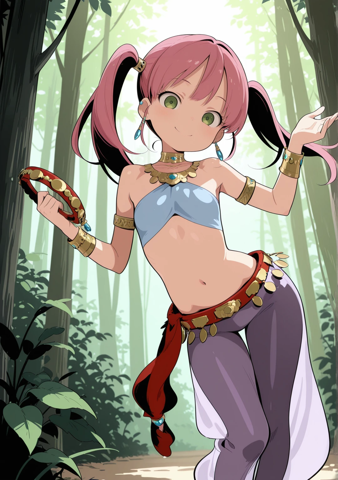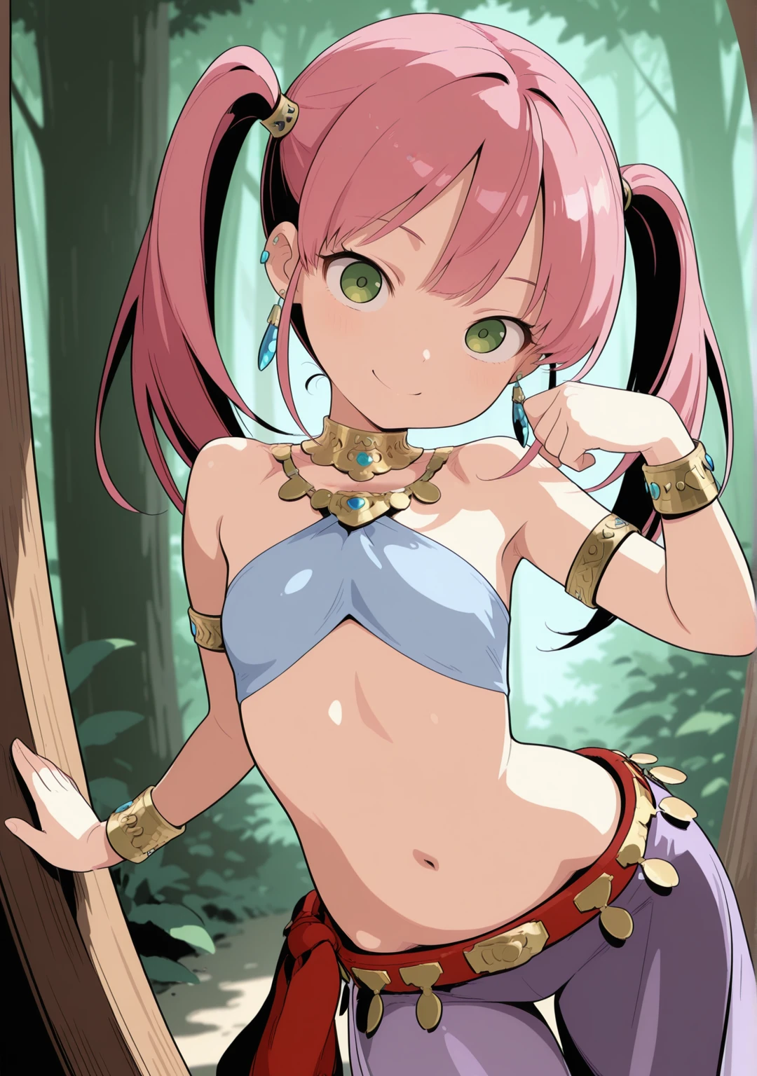 recommend:pink hair,green eyes,twintails,armlet,bare shoulders,belt,bracelet,anklet,arabian clothes,crop top,halterneck,harem outfit,neck ring,necklace,earrings,harem pants,jewelry,long hair,navel,purple pants,red footwear,see-through,shoes,