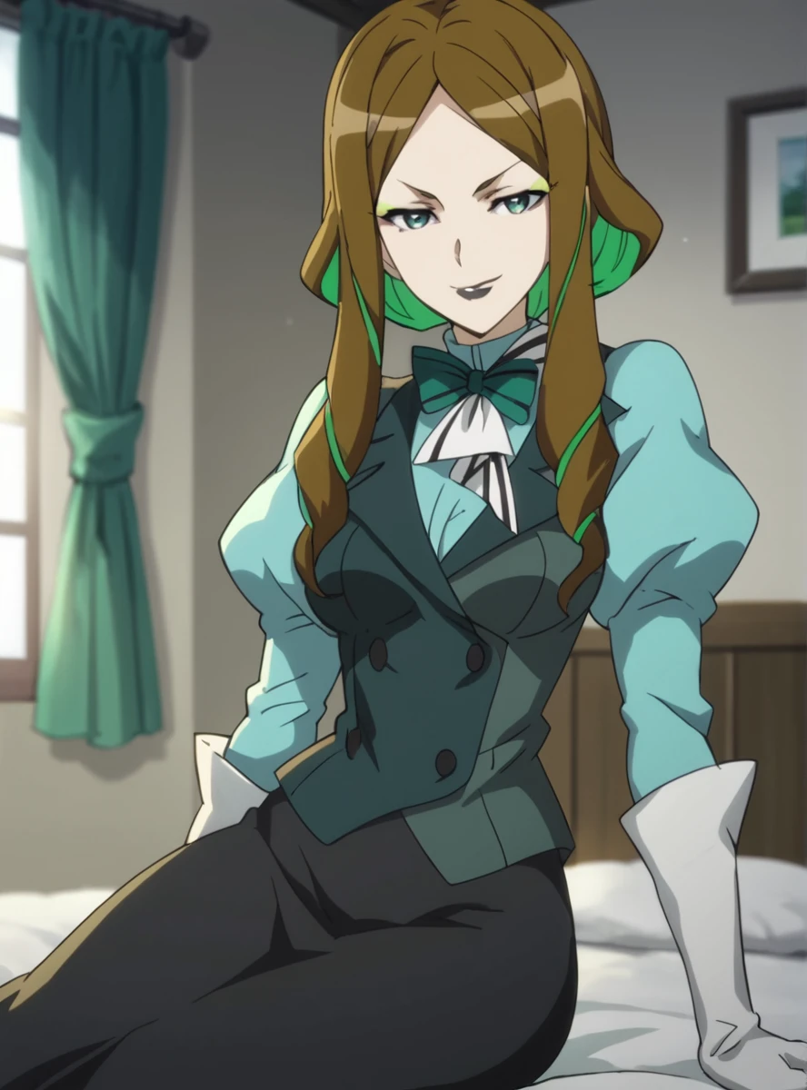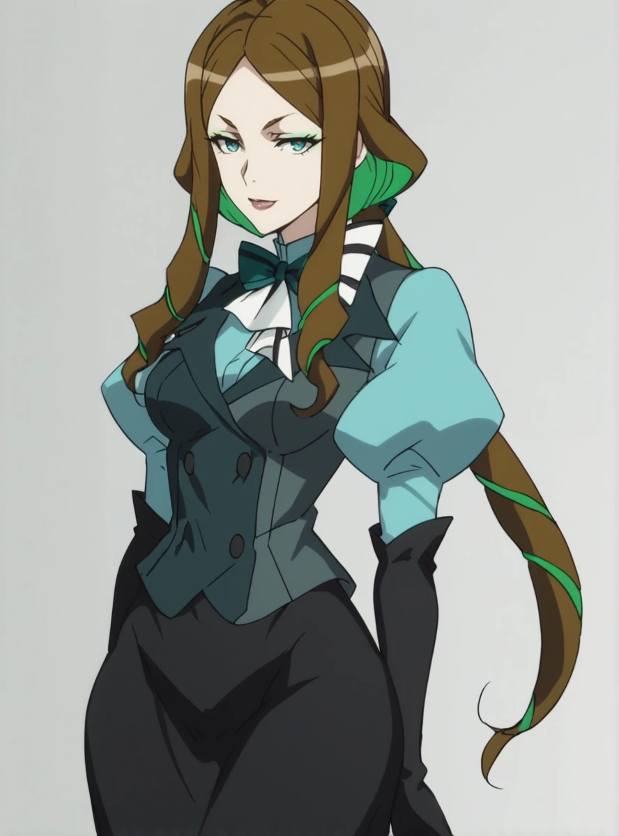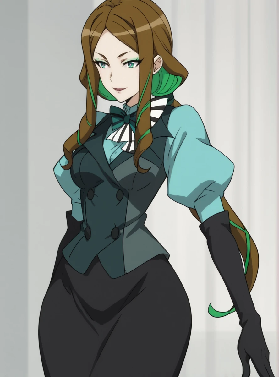 1girl, black lips, multicolored hair, two-tone hair, solo, makeup, brown hair, green hair, long hair, colored inner hair, gloves, lipstick, eyeshadow wide hips, narrow waist, dress