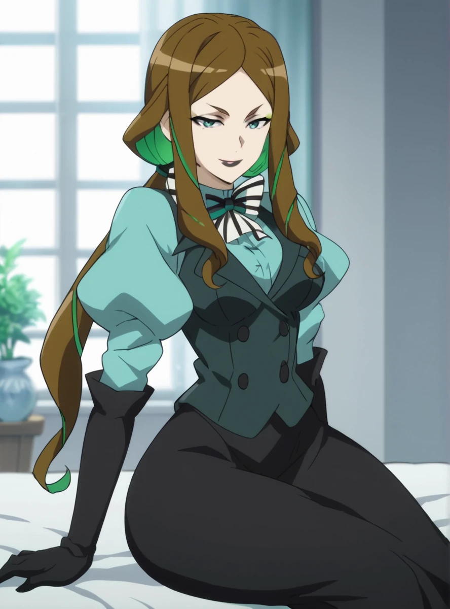 Prompts:1girl, black lips, multicolored hair, two-tone hair, solo, makeup, brown hair, green hair, long hair, colored inner hair, gloves, lipstick, eyeshadow wide hips, narrow waist, dress