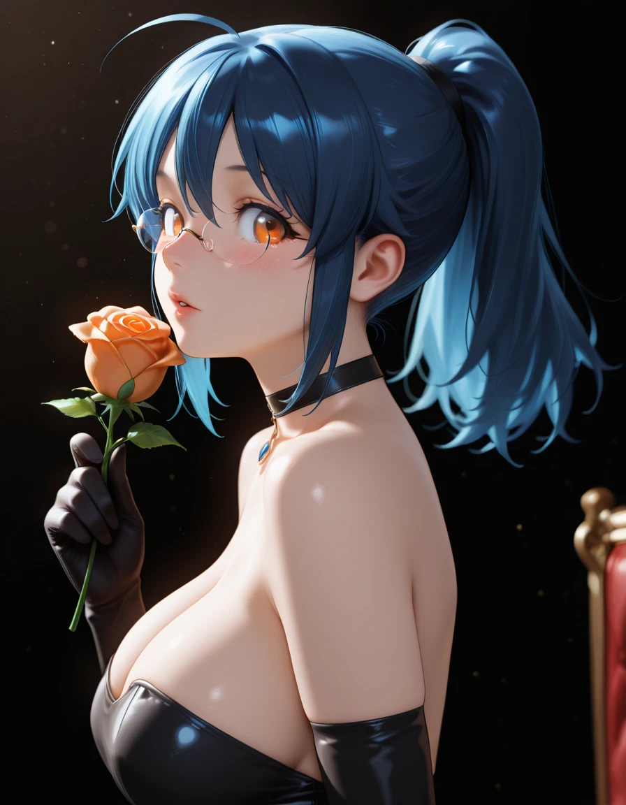 Tags:hinata_aki, 1girl, long_hair, blue_hair, rimless_eyewear, antenna_hair, large_breasts