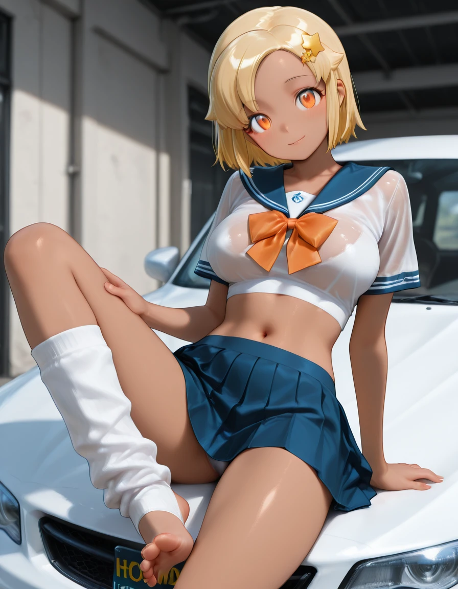 Tags:Angol_Mois, 1girl, blonde_hair, short_hair, orange_eyes, dark_skin, star_hair_ornament, large_breasts