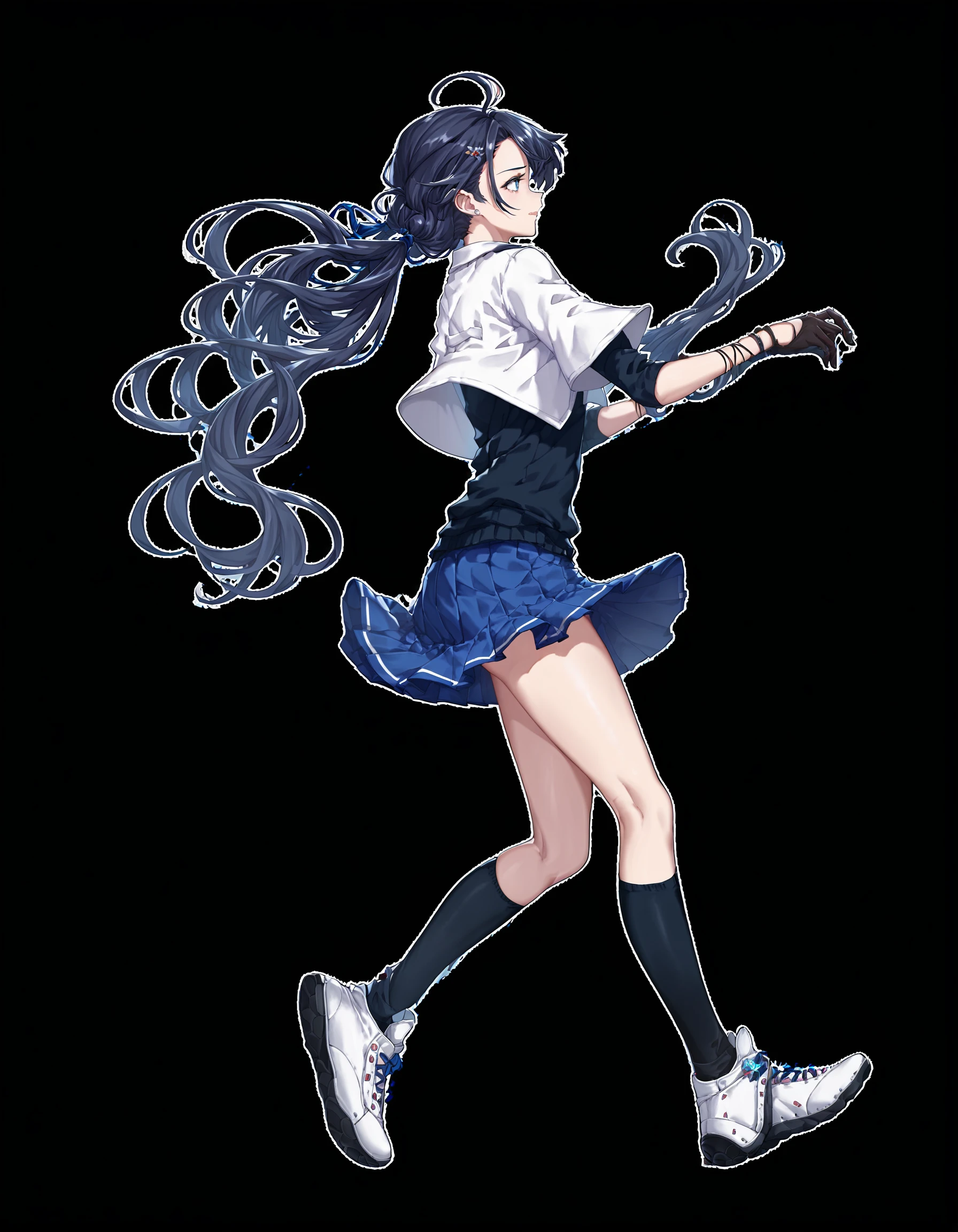 aiwei,1girl,solo,twintails,long hair,jacket,black hair,choker,hair ribbon,low twintails,ribbon,shirt,blue ribbon,hair ornament,white jacket,breasts,bangs,green eyes,earrings,hairclip,ahoge,collarbone,black shirt,jewelry,blue skirt,pleated skirt,