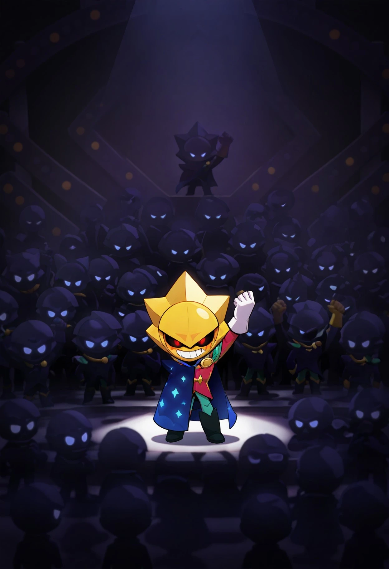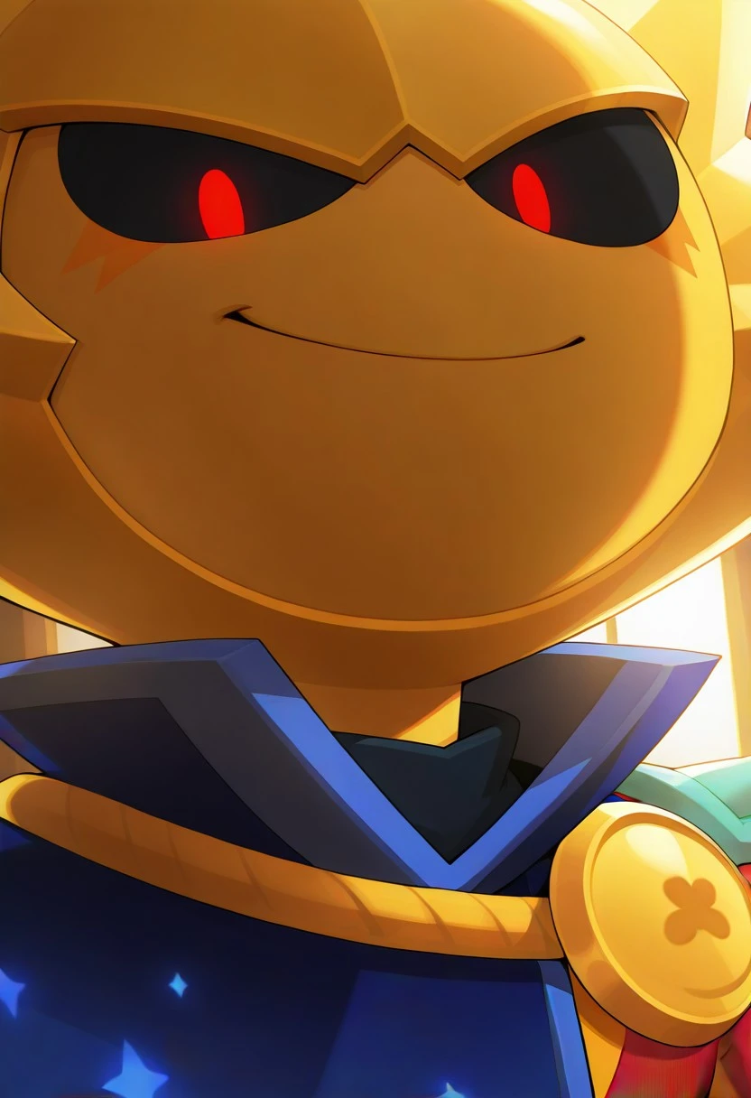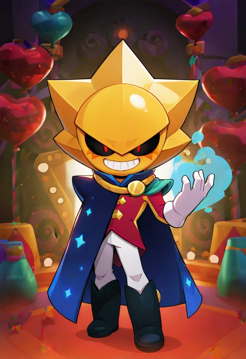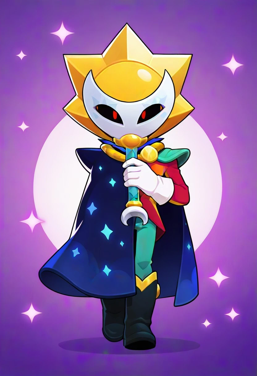 Sirius_Brawl, 1boy, solo, red eyes, golden star mask, red magician suit, dark blue cape with stars on it, black boots with yellow rims, white pants, grey shoulder pads, black sclera, gloves