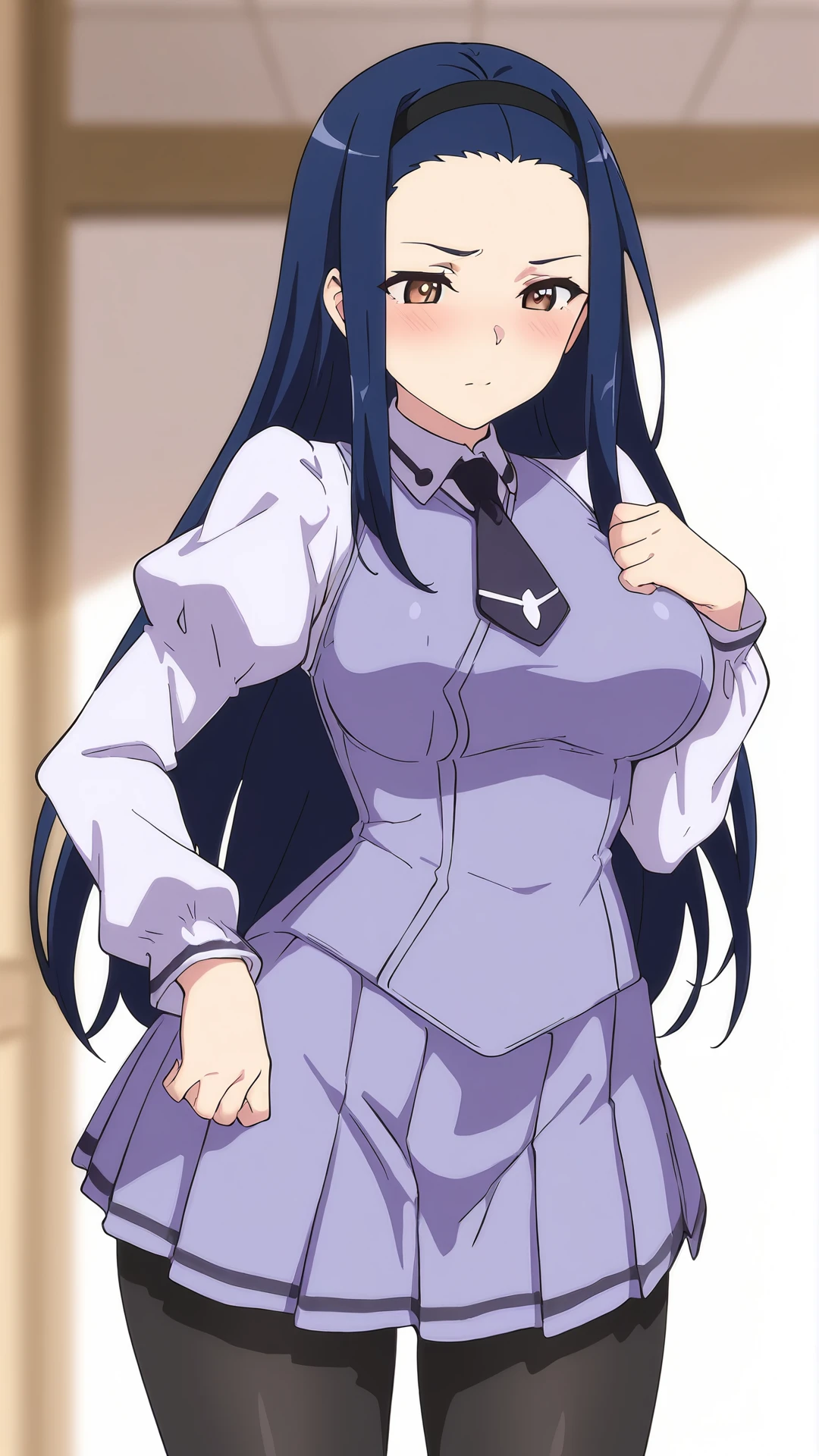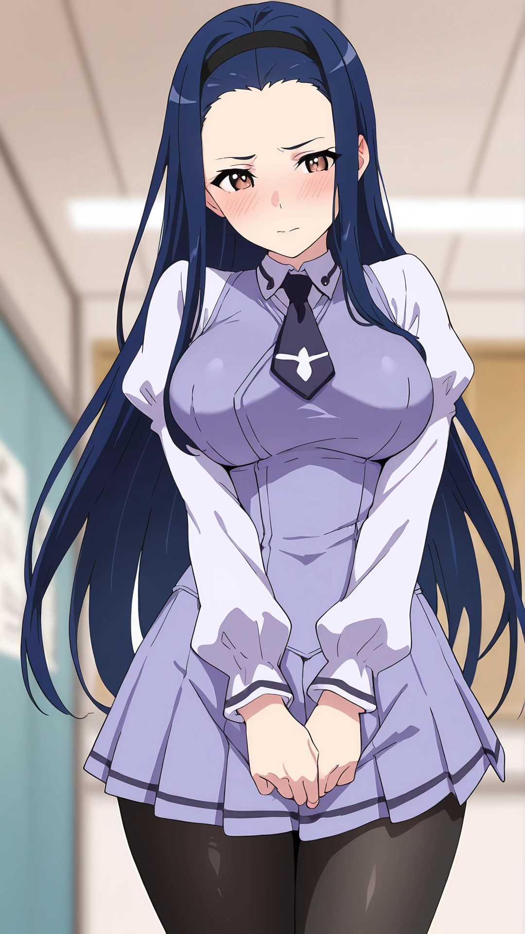 ,Hiiragi Yumie,1girl,pantyhose,school uniform,long hair,blue hair,hairband,skirt,brown eyes,
