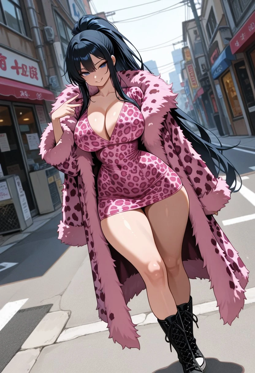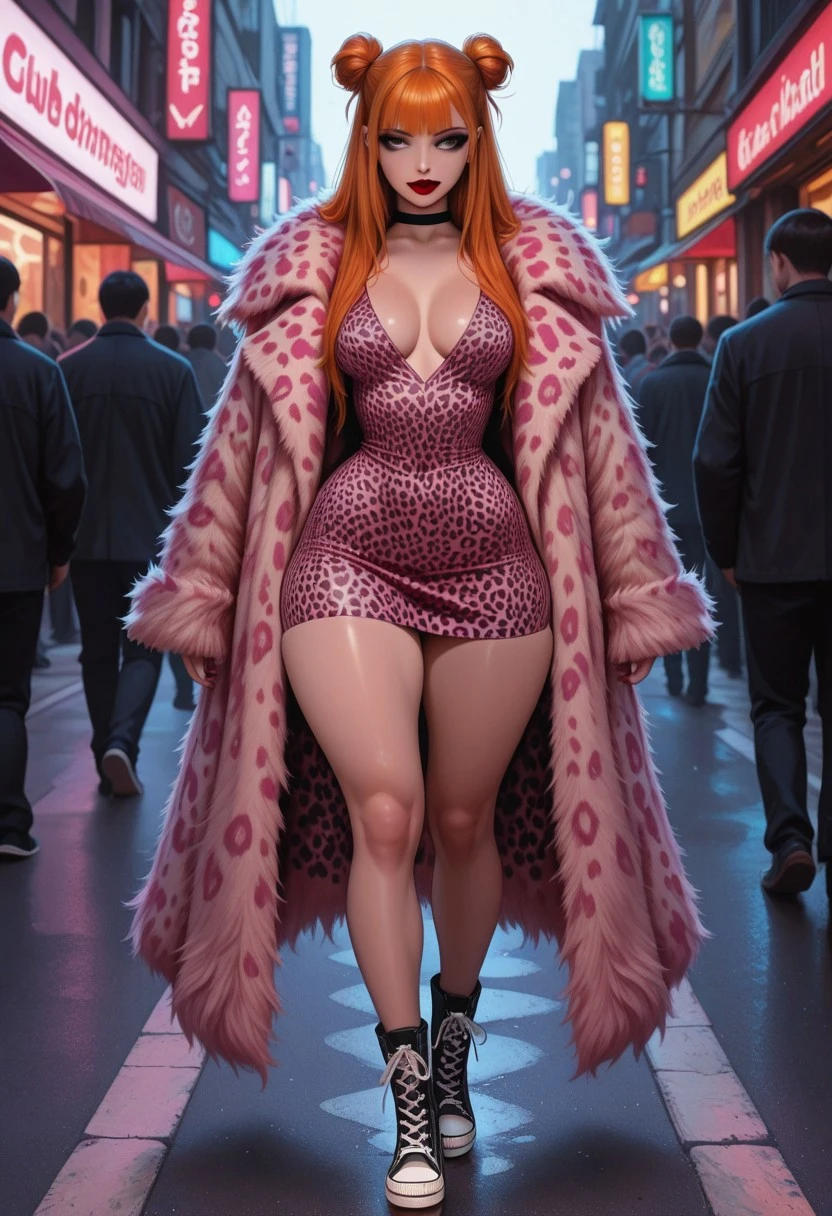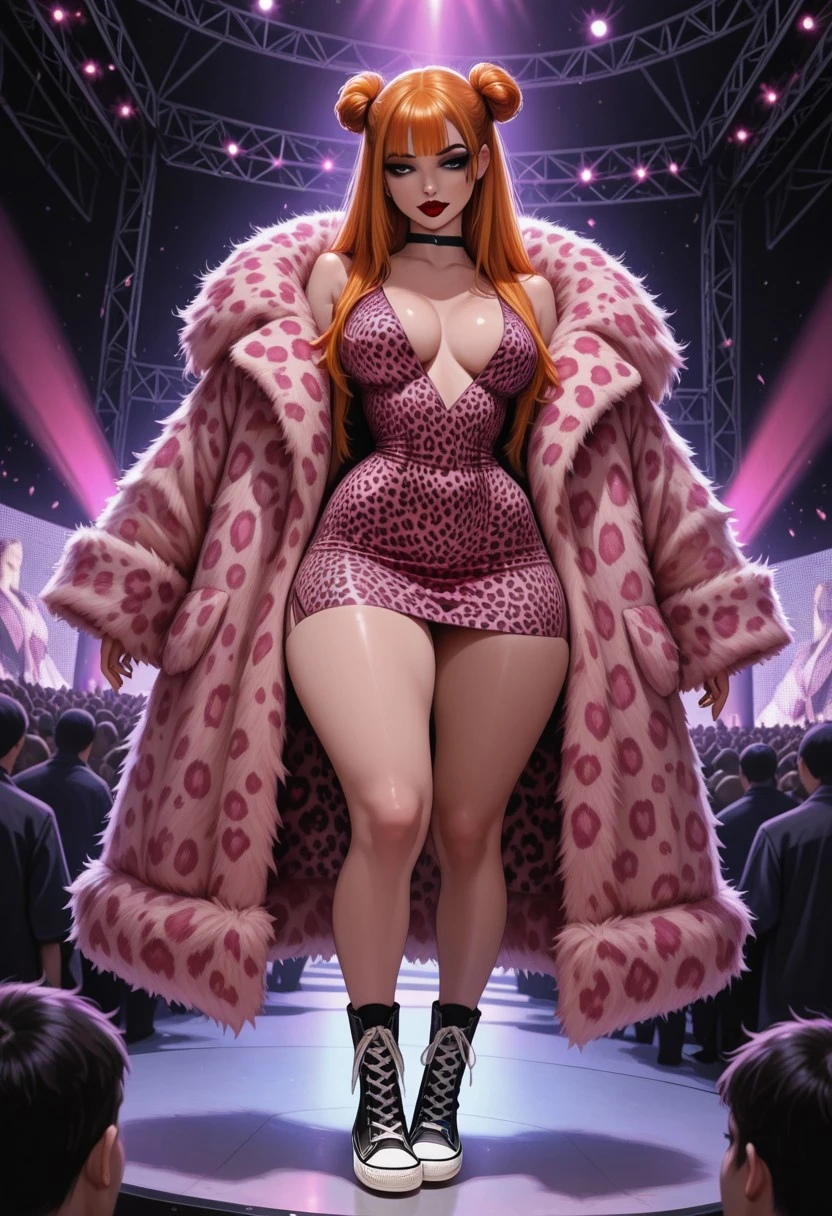 pink cheetah animal print outfit (very long fur coat, v-neck, short dress, knee-high converse boots)