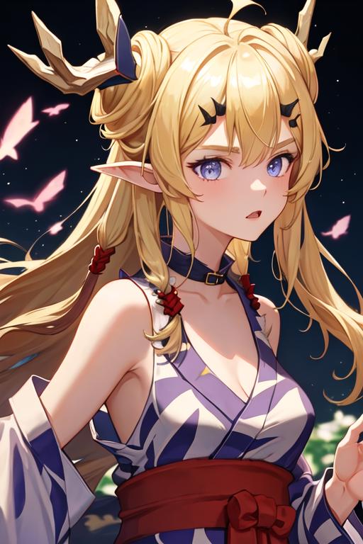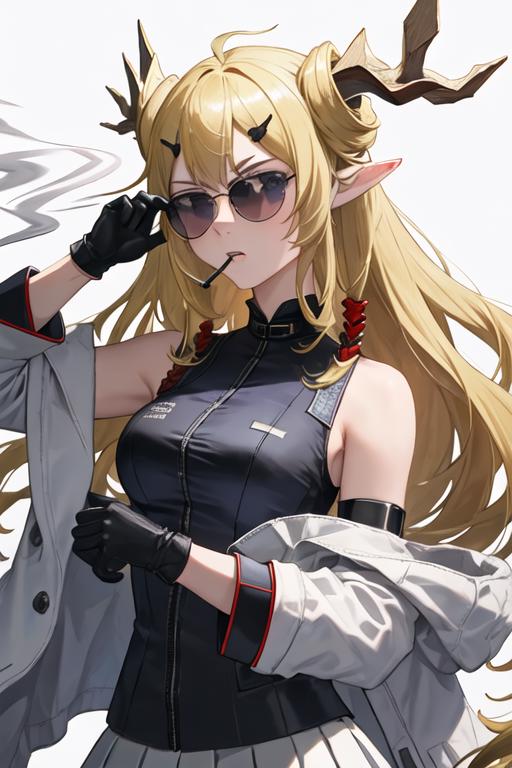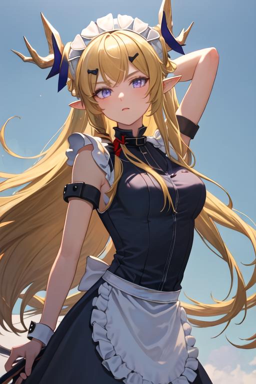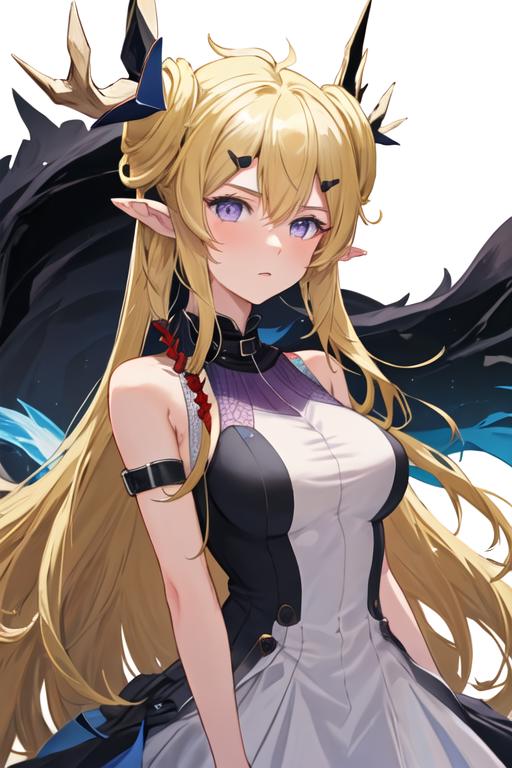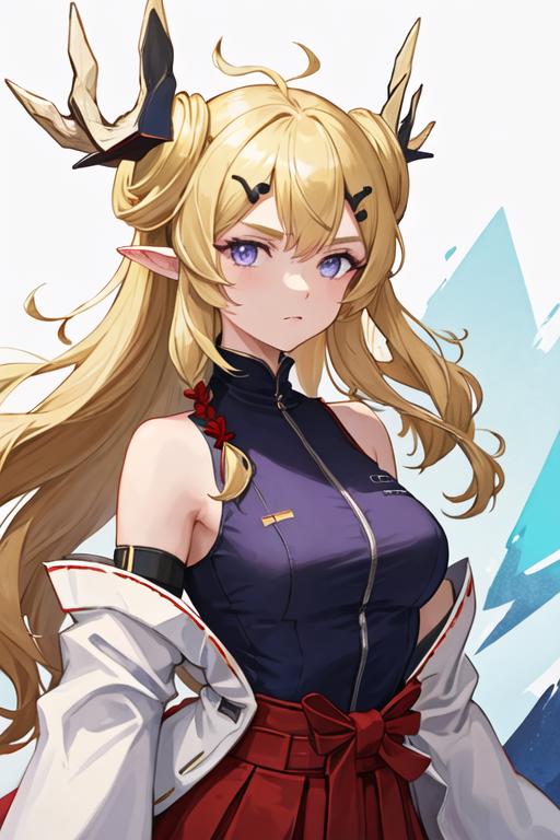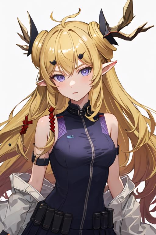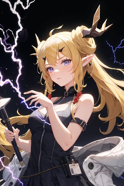 The trigger word is leizi_arknights, and the recommended tags are best quality, masterpiece, highres, solo, {leizi_arknights:1.15}, long_hair, blonde_hair, horns, pointy_ears, bangs, upper_body, purple_eyes, sleeveless, hair_ornament, blue_eyes, breasts.