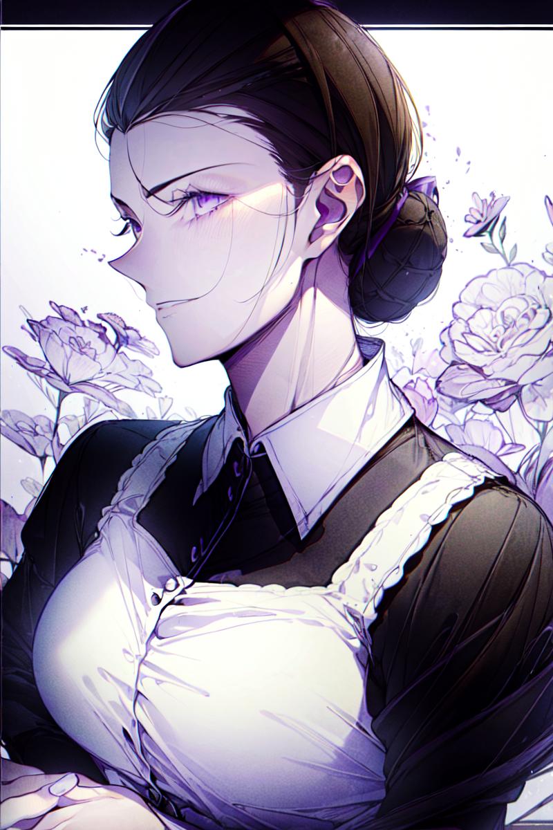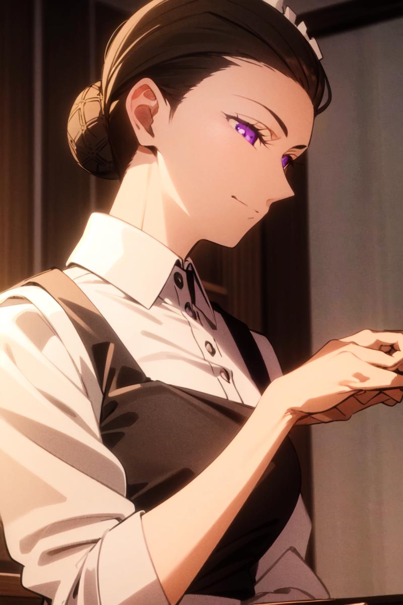 To summon her use the trigger Tags plus following tags: solo, 1girl, black hair, smile, single hair bun, looking at viewer, purple eyes, apron, hair bun, brown hair, maid