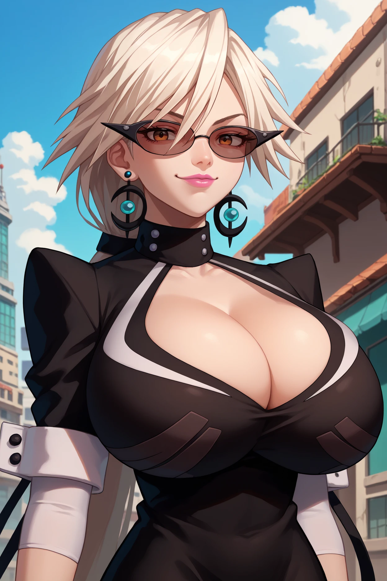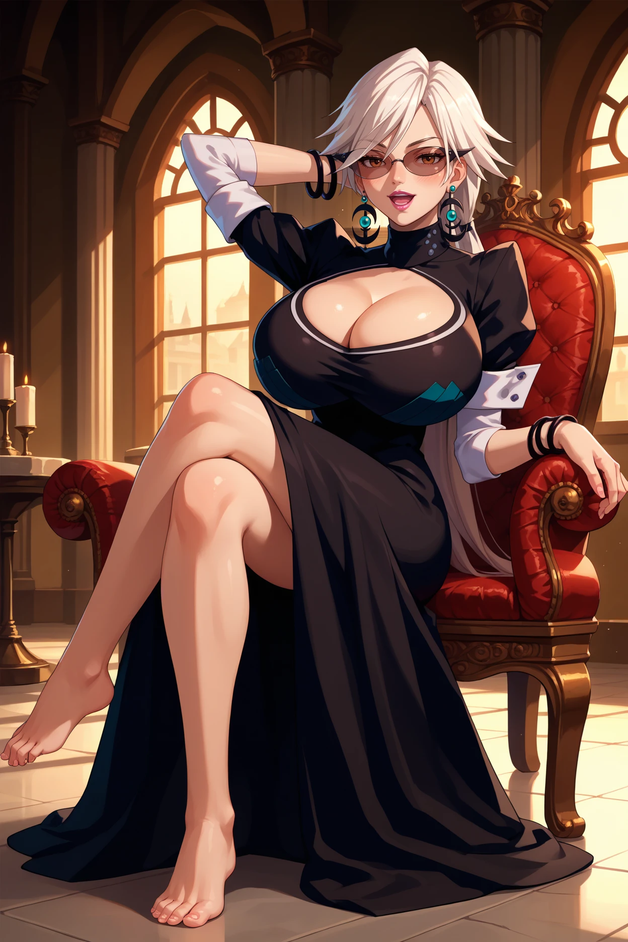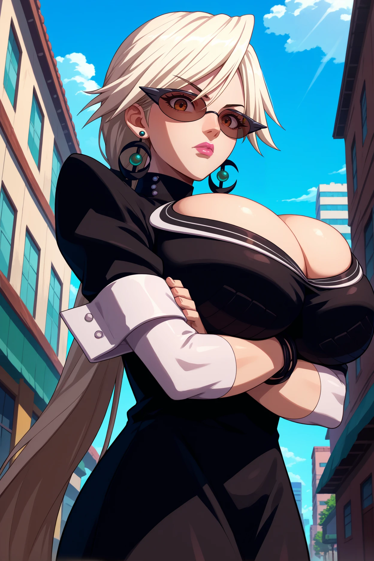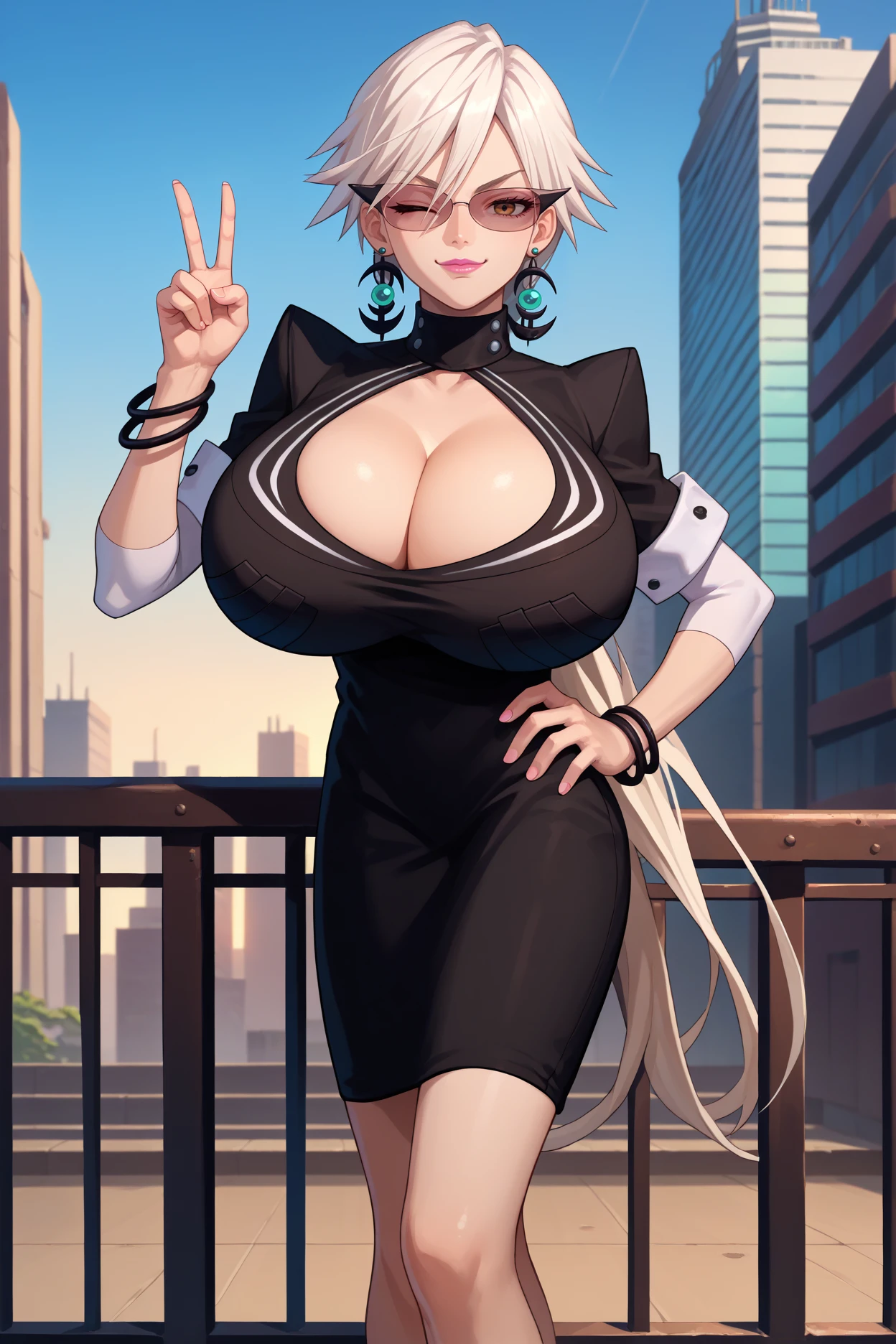 basquashhg, low ponytail, very long hair, white hair, brown eyes, sunglasses, lipstick, bursting breasts