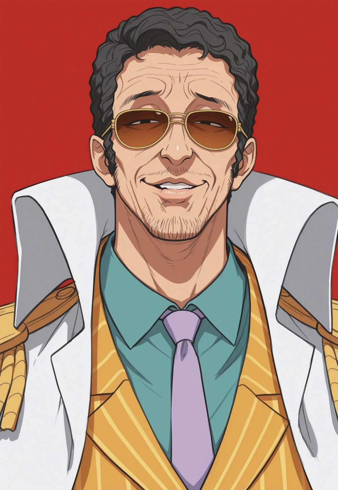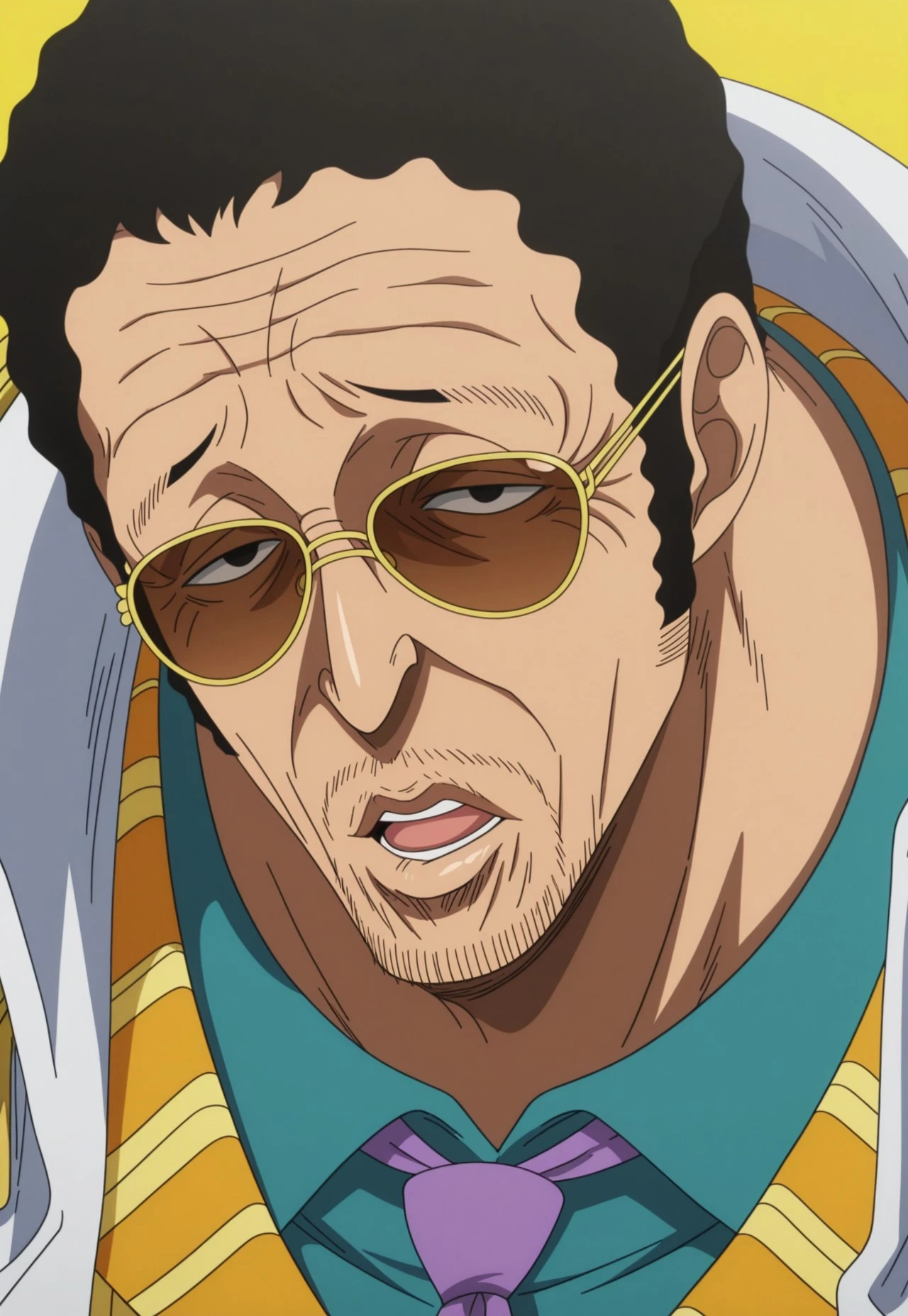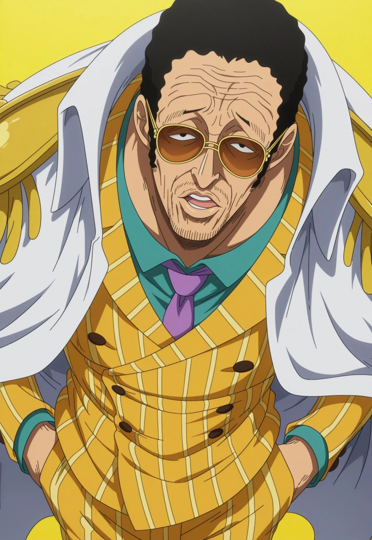 kizaru, black hair, very short hair, wavy hair, smooth hair, black eyes, slanted eyes, facial hair, stubble, goatee, sunglasses, wrinkles, lip outline, detailed face, teal shirt, light purple tie, yellow pinstripe suit, white off-shoulder coat, epaulettes, yellow pants, white shoes