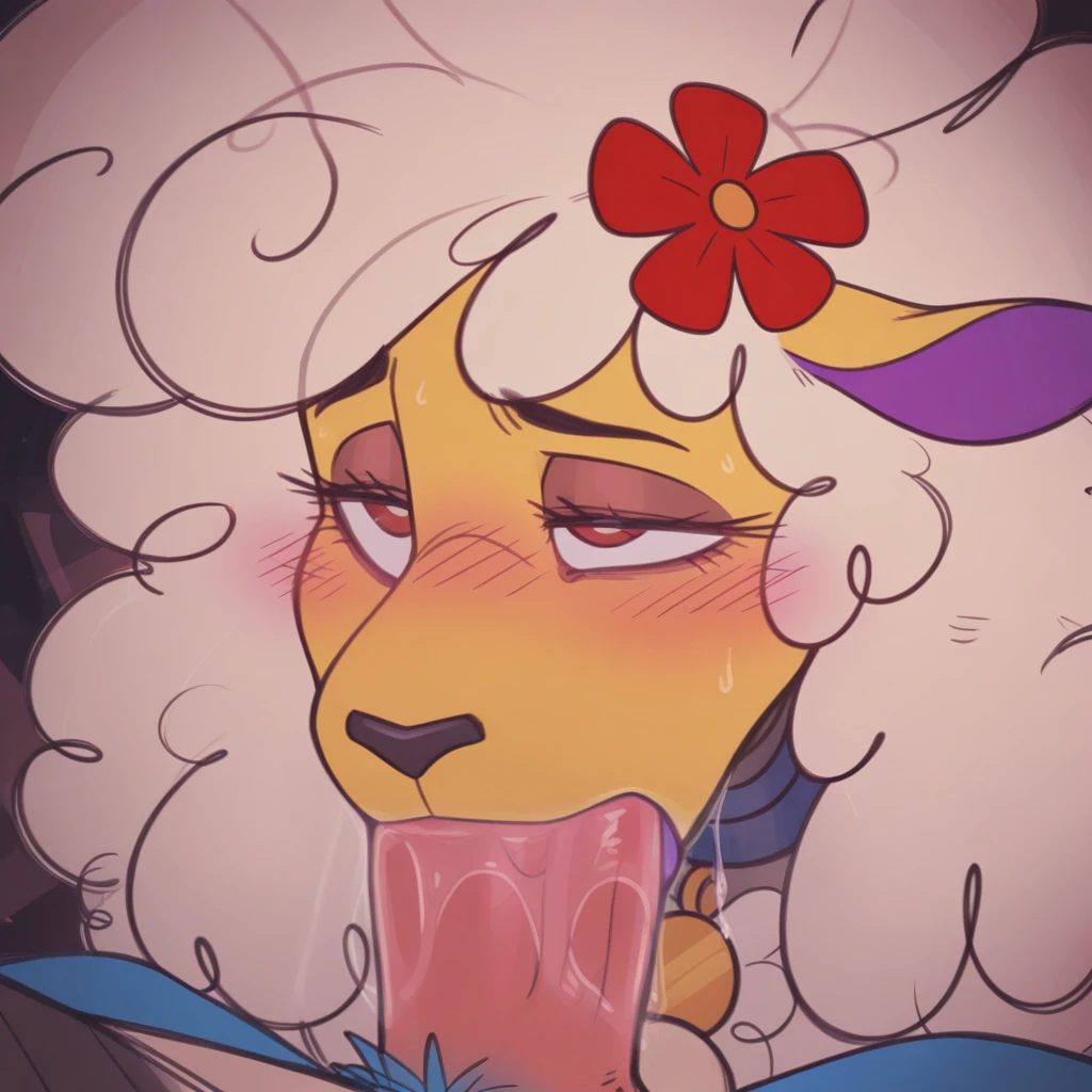 sh4_dmwd, anthro, female, solo, white wool, white hair, big hair, wool hair, flower in hair, red flower, yellow skin, thick bottom lip, purple lips, ears down, animal ears, purple inner ear, blush, philtrum, black nose, snout, eyebrows, purple eyeshadow, eyelashes, wide , , voluptuous, hair on shoulders, hoof hands, white fur, yellow countershading, black eyes, hands, yellow hands, 5 fingers