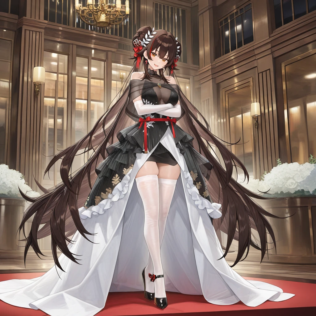 Type97GFL2, Tpe_Drs, donut hair bun, brown hair, brown eyes, red streaks, streaked hair, laurel crown, colored inner hair, white headwear, very long hair, hair net, high-low dress, sleeveless dress, black dress, halterneck, see-through cleavage, lace choker, black choker, black bodystocking, floral print, striped skirt, long dress, frilled dress, bare shoulders, off-shoulder capelet, see-through capelet, two-sided dress, black capelet, elbow gloves, white gloves, red ribbon, waist ribbon, red flower, rose, white thighhighs, black high heels, gold colored shoe sole, black ankle strap, strappy heels,GFL2 Default Outfit: