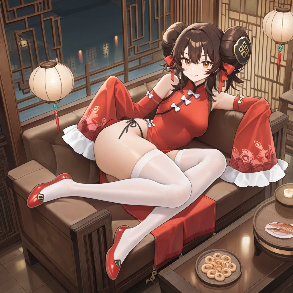 Type97GFL2, Tpe_CN, donut hair bun, hude hair bun, brown hair, medium hair, brown eyes, red ribbon, hair ribbon, china dress, red dress, sleeveless, short dress, side-tie panties, black panties, black trim, white bow, bare shoulders, detached sleeves, sleeves past fingers, red sleeves, frilled sleeves, fish print, white thighhighs, red footwear, flats,School Outfit: