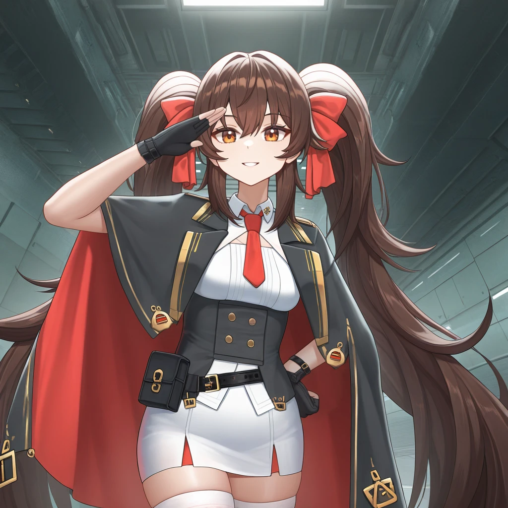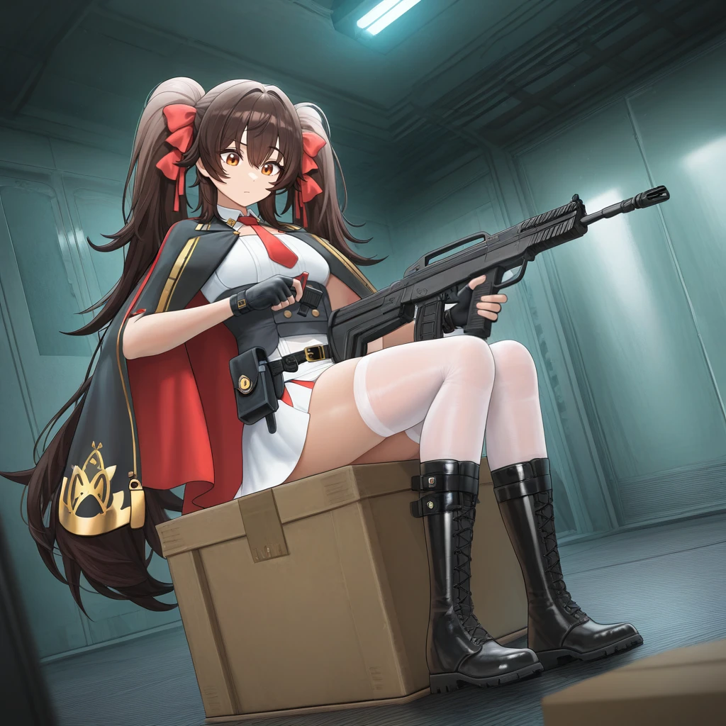 Type97GFL2, Tpe_Def, brown hair, brown eyes, long hair, twintails, red ribbon, hair ribbon, collared shirt, sleeveless shirt, white shirt, collarbone cutout, red necktie, short necktie, black cape, cape, two-sided cape, black corset, corset, double-breasted, black belt, loose belt, belt pouch, miniskirt, white skirt, white thighhighs, black gloves, fingerless gloves, cloak, asymmetrical gloves, knee boots, black footwear, leg pouch,Chinese Outfit: