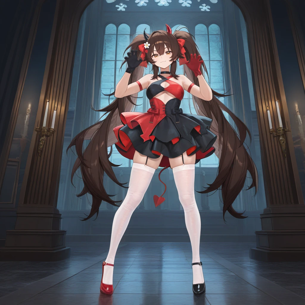 Type97GFL2, Tpe_Hlw, brown hair, long hair, brown eyes, twintails, halloween costume, black garter straps, garter straps, two-tone dress, two-tone clothes, halter dress, criss-cross halter, black dress, red dress, underboob cutout, clothing cutout, cleavage cutout, criss-cross straps, side cutout, cross-laced dress, frilled skirt, layered dress, two-sided skirt, black skirt, black gloves, red gloves, mismatches gloves, red wrist strap, red arm strap, bare shoulders, black choker, mismatched horns, demon horns, hair flower, white flower, hair bow, red bow, demon tail, white thighhighs, mismatched footwear, high heels, red heels, black heels,Wedding Outfit:
