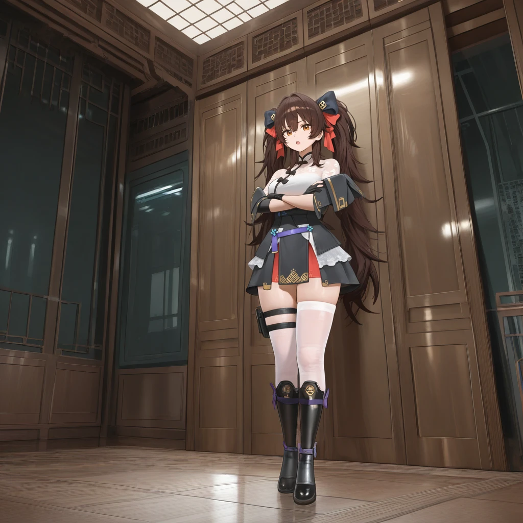 Type97GFL2, Tpe_Alt, brown hair, long hair, brown eyes, twintails, underbust, white shirt, shirt, madarin collar, chinese clothes, lace-trimmed skirt, skirt, layered skirt, multicolored skirt, see-through, asymmetrical skirt, off-shoulder jacket, thigh holster, white thighhighs, black bow, hair bow, red ribbon, hair ribbon, partially fingerless gloves, black gloves, cropped jacket, black jacket, open jacket, black sleeves, third-quarter sleeves, purple belt, shin guards, black shin guards, black shoes, shoes, block heels,Martial Arts Outfit: