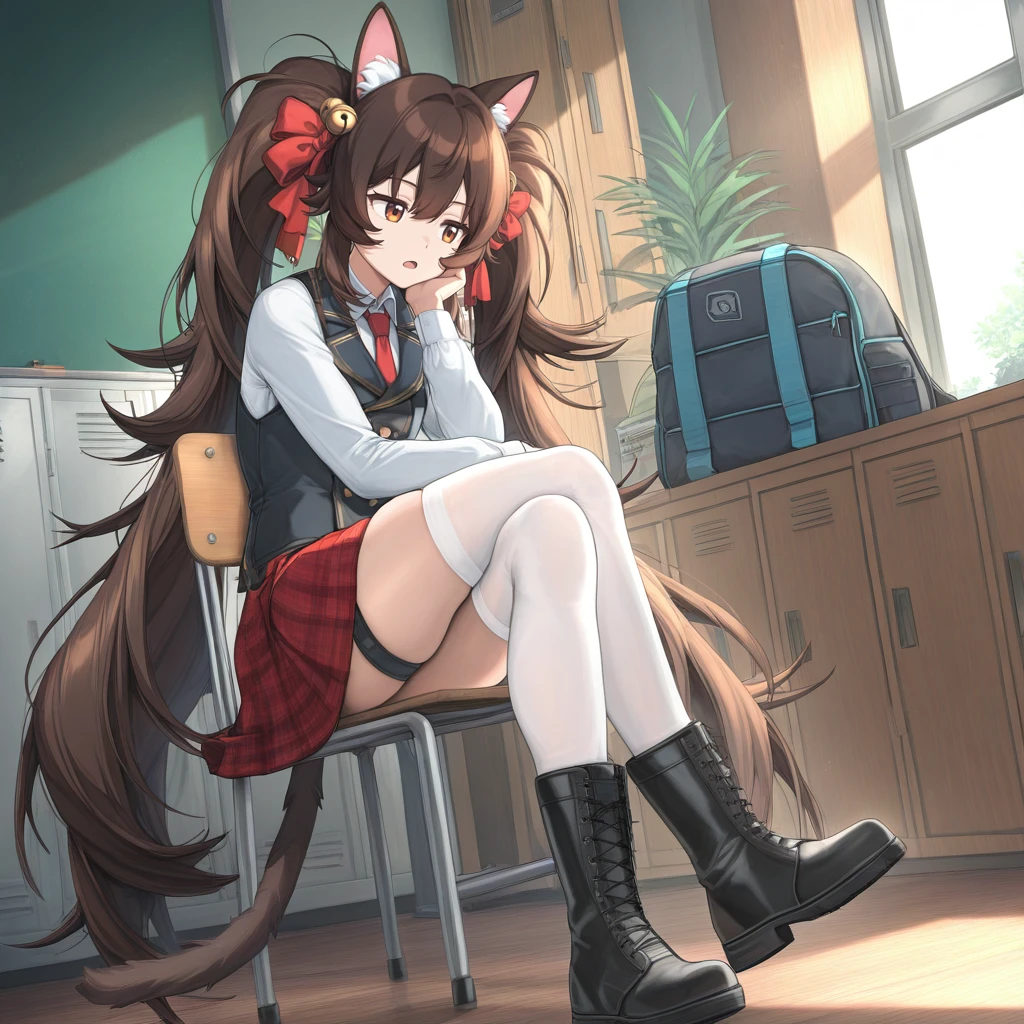 Type97GFL2, Tpe_Sch, twintails with braided base, brown hair, brown eyes, long hair, school uniform, backpack, black vest, vest, double-breasted, white shirt, dress shirt, white sleeves, long sleeves, hair bell, hair bow, red bow, red necktie, necktie, cat ears, animal ear fluff, plaid skirt, red skirt, cat tail, white thighhighs, thigh holster, black boots, lace-up boots,Halloween Outfit: