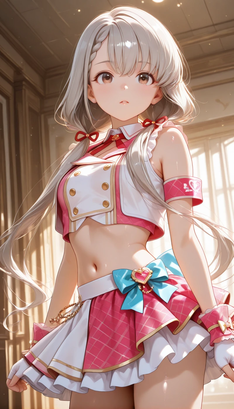 shirt, skirt, gloves, bow, navel, ribbon, bare shoulders, hair ribbon, thighs, sleeveless, midriff, white gloves, stomach, fingerless gloves, vest, red ribbon, crop top, wrist cuffs, sleeveless shirt, buttons, blue bow, frilled skirt, armband, cropped jacket, pink skirt, pink shirt, cropped shirt, layered skirt, idol, sleeveless jacket, white vest, idol clothes, cropped vest,