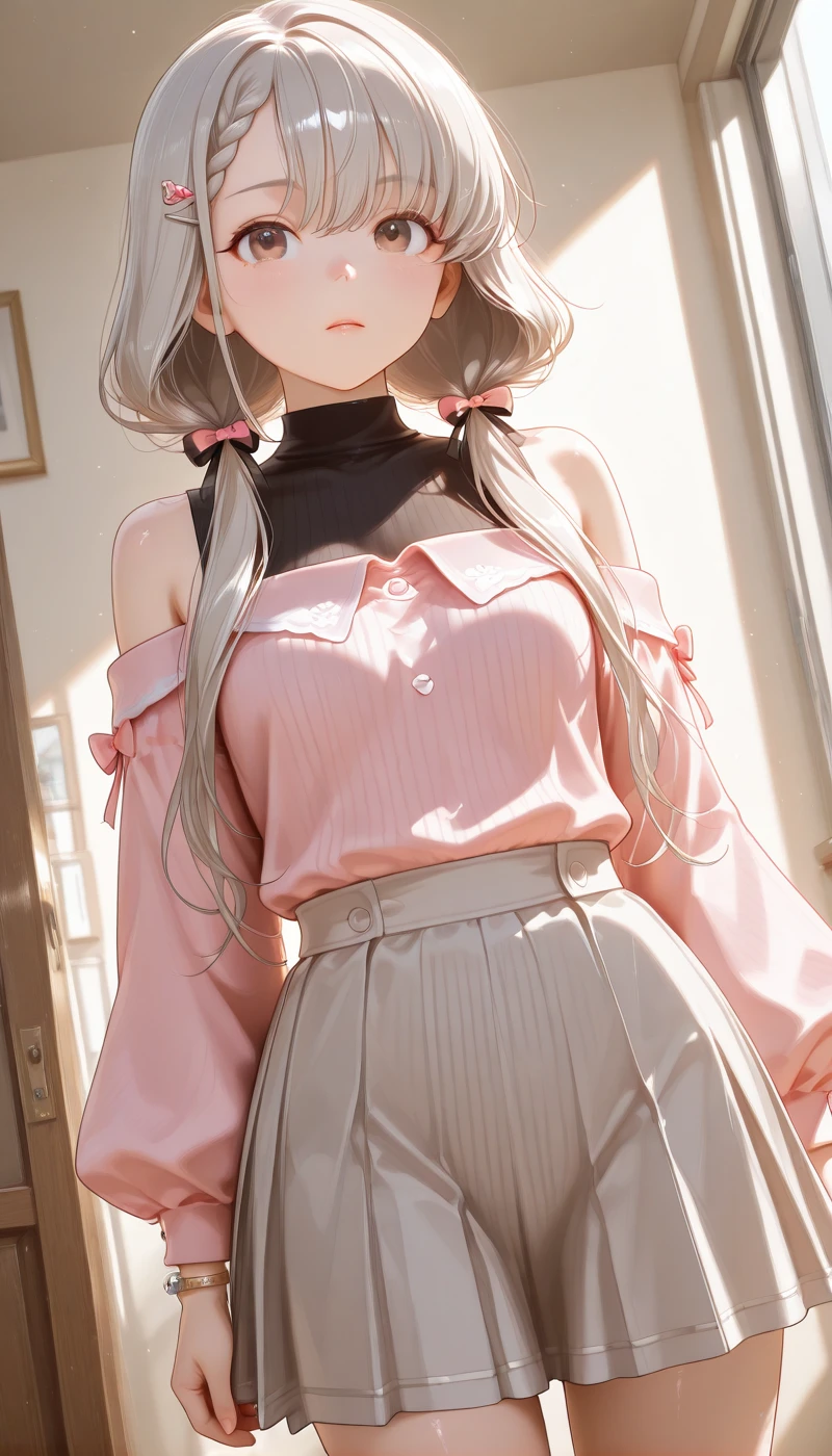 shirt, skirt, long sleeves, hair ornament, bow, ribbon, jewelry, bare shoulders, very long hair, hair ribbon, hair bow, pleated skirt, sleeveless, puffy sleeves, hairclip, off shoulder, bracelet, black shirt, sleeveless shirt, black ribbon, blue bow, turtleneck, white skirt, pink bow, hair over shoulder, puffy long sleeves, grey skirt, pink shirt, off-shoulder shirt, miniskirt, striped clothes, sweater, vertical-striped clothes